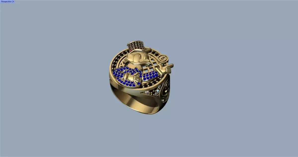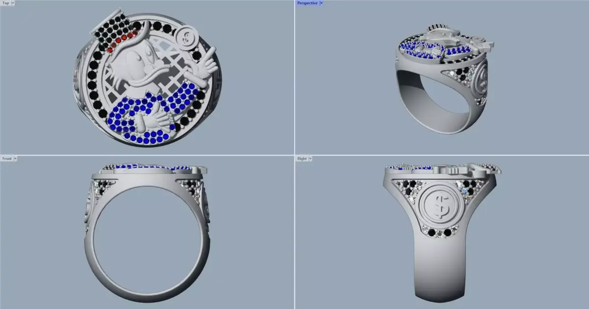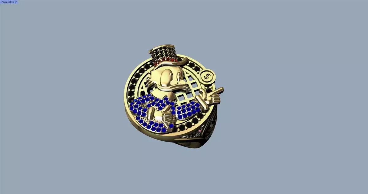 Mc Duck ring with 1 mm and 1.25 mm gems for a weight of 25 gr in 18 k gold.