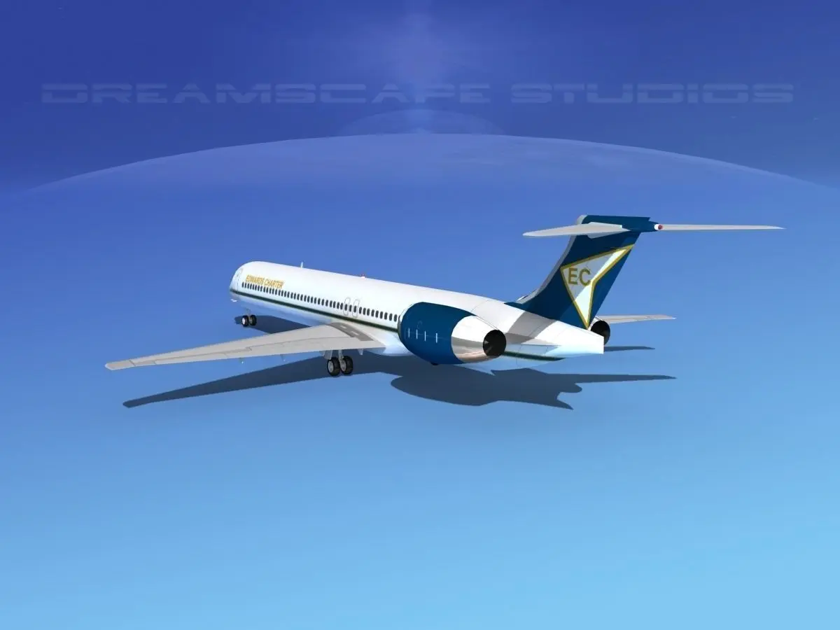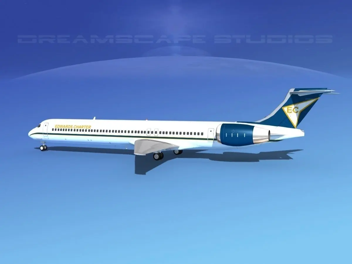 McDonnell Douglas MD83 Edwards Charter This model was originally built in Max 13 near to scale (within 3-4% of scale) and fully textured. It comes with all the materials and textures shown in renderings here.It has a detailed exterior including radio antennas and pitot tubes. Landing gear have been finished with a moderate amount of detail too.