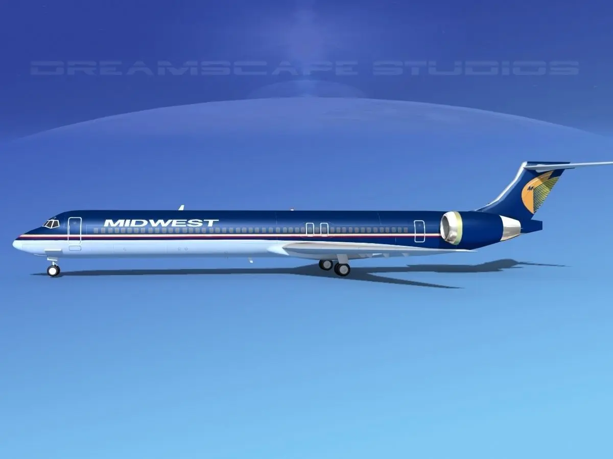 McDonnell Douglas MD83 Midwest This model was originally built in Max 13 near to scale (within 3-4% of scale) and fully textured. It comes with all the materials and textures shown in renderings here. It has a detailed exterior including radio antennas and pitot tubes. Landing gear have been finished with a moderate amount of detail too. It comes with animateable ailerons, flaps, elevators, rudder, landing gear, landing gear doors and turbines. It is available in several formats for a wide variety of end users. This model comes with many different liveries. It is built to be used in in-flight or airport ground animations and video or simulation. It can also be used to populate an airport scene. MD-83 is a longer range version of the MD-81 basic family model aircraft. It has a greater fuel capacity with two additional fuel tanks and more powerful engines. The -83 also has higher operating weights and it could carry up to 155 passengers and had a range of 2500 miles. The first one was delivered in 1985 and the last was delivered in 1999.