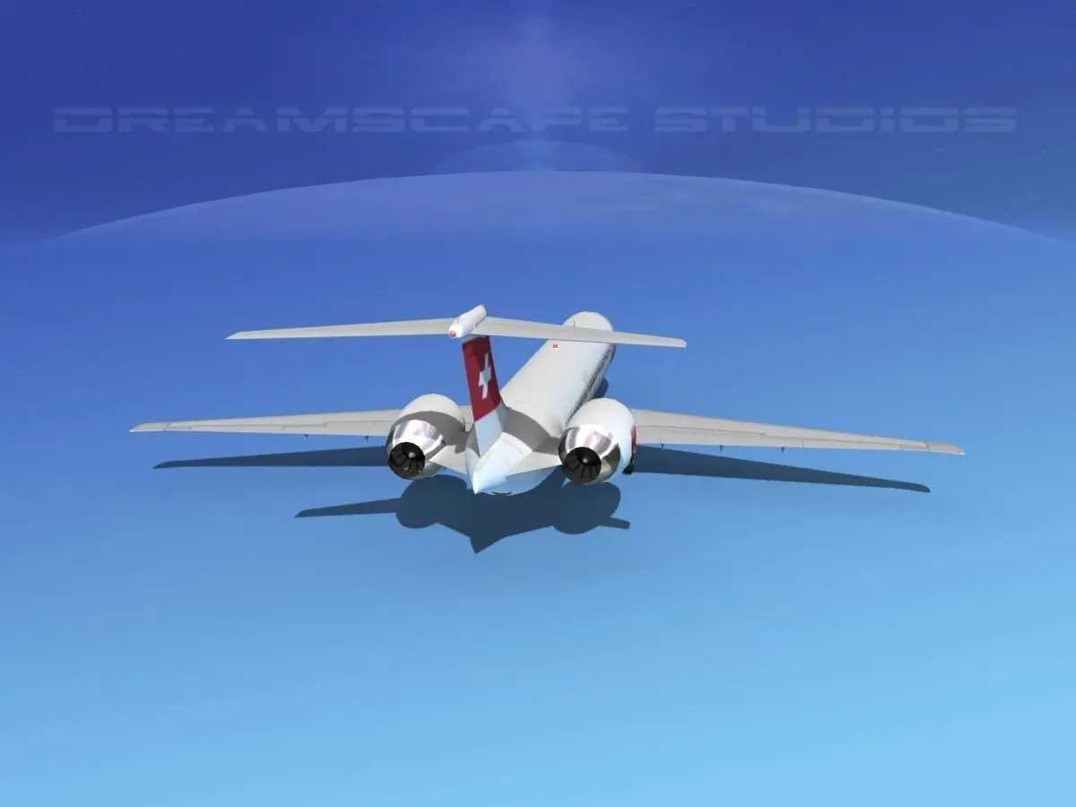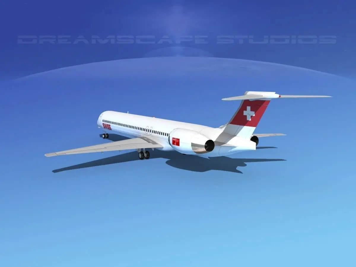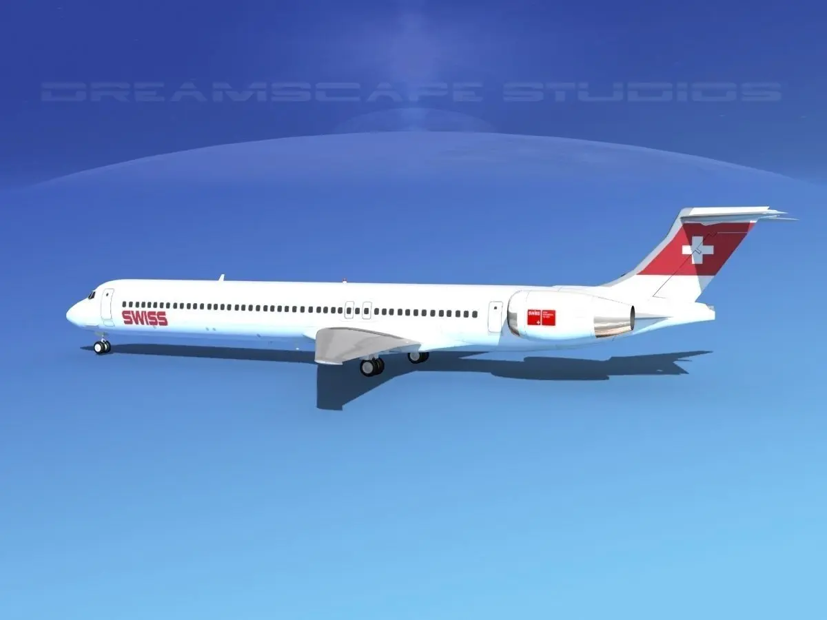 McDonnell Douglas MD83 Swissair This model was originally built in Max 13 near to scale (within 3-4% of scale) and fully textured. It comes with all the materials and textures shown in renderings here. It has a detailed exterior including radio antennas and pitot tubes. Landing gear have been finished with a moderate amount of detail too. It comes with animateable ailerons, flaps, elevators, rudder, landing gear, landing gear doors and turbines. It is available in several formats for a wide variety of end users. This model comes with many different liveries. It is built to be used in in-flight or airport ground animations and video or simulation. It can also be used to populate an airport scene. MD-83 is a longer range version of the MD-81 basic family model aircraft. It has a greater fuel capacity with two additional fuel tanks and more powerful engines. The -83 also has higher operating weights and it could carry up to 155 passengers and had a range of 2500 miles. The first one was delivered in 1985 and the last was delivered in 1999.