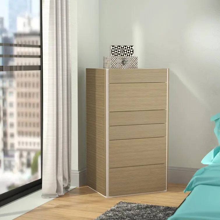 - Sometimes in our bedrooms, it seems like storage space is at a premium, especially when it comes to our wardrobe. Don’t worry, this drawer chest is here to help. Crafted from manufactured wood, this piece hosts six drawers, offering ample space to store your delicates and any other belongings you want to tuck away. Its neutral lacquered finish allows it to blend with a variety of color schemes, while a smooth surface offers the perfect stage to display photographs, candles, and more.
