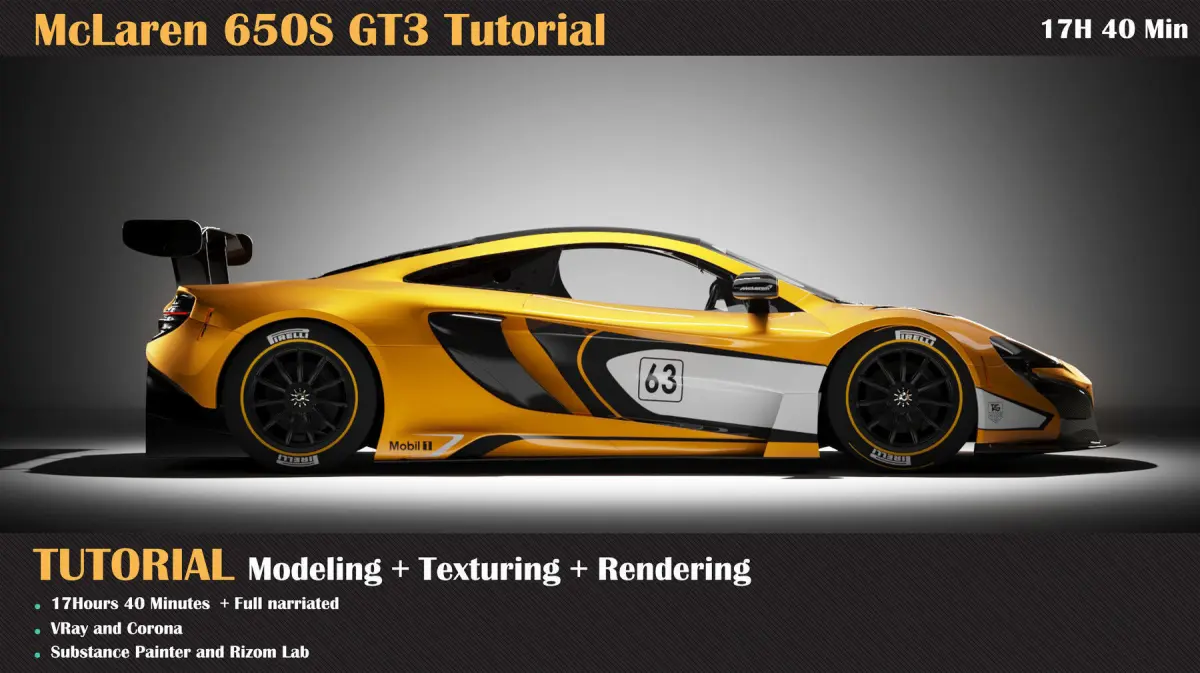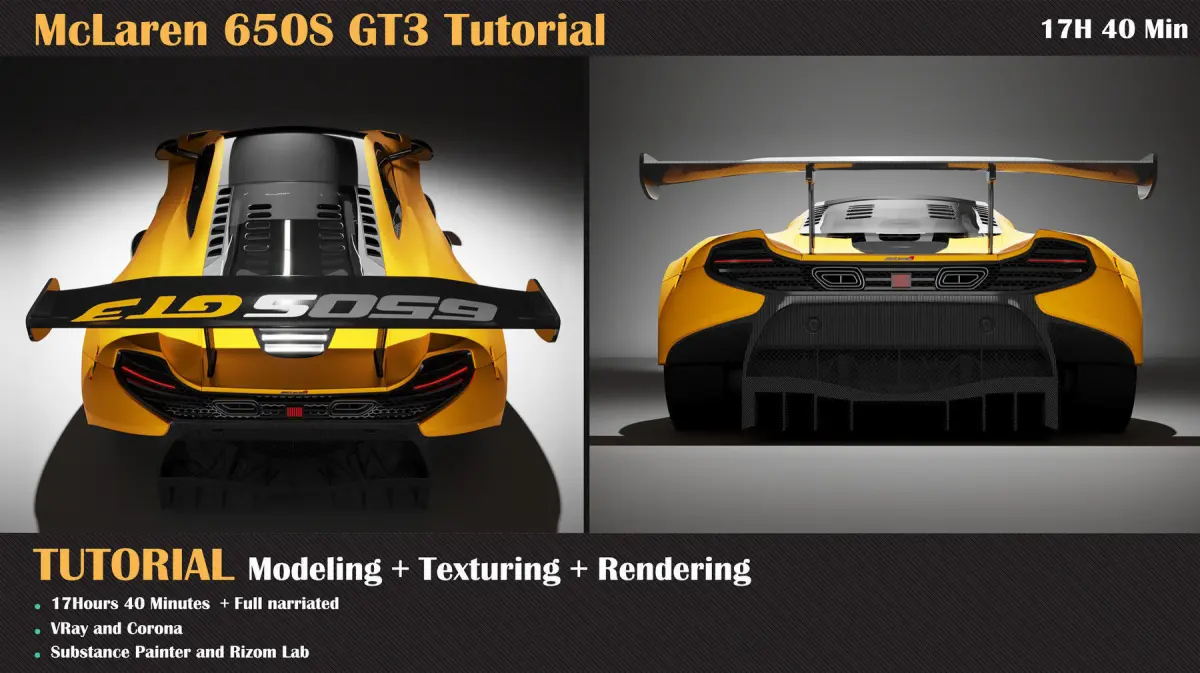 the McLaren tutorial is aimed at beginners and intermediates. You should know at least basic knowledge of 3ds max, Vray, Corona, Substance Painter, and Rizom Lab.