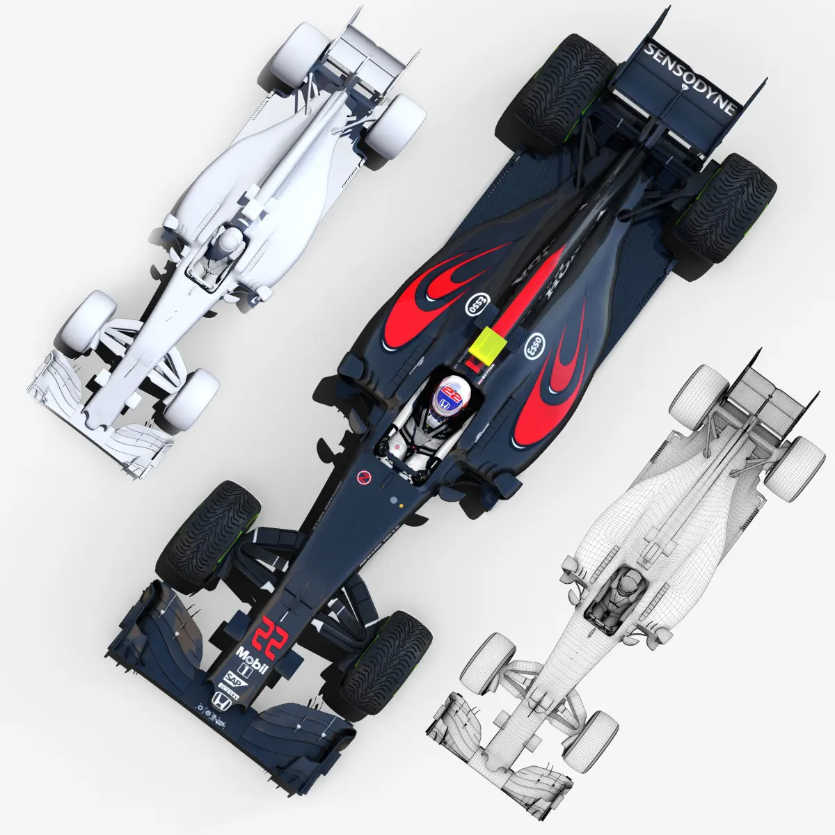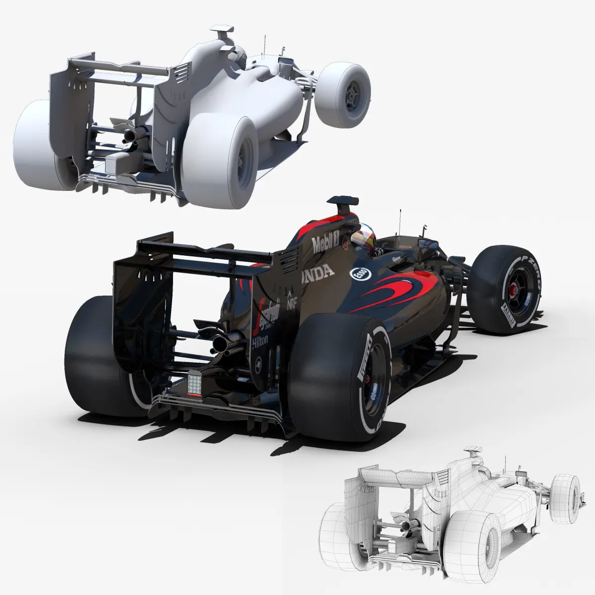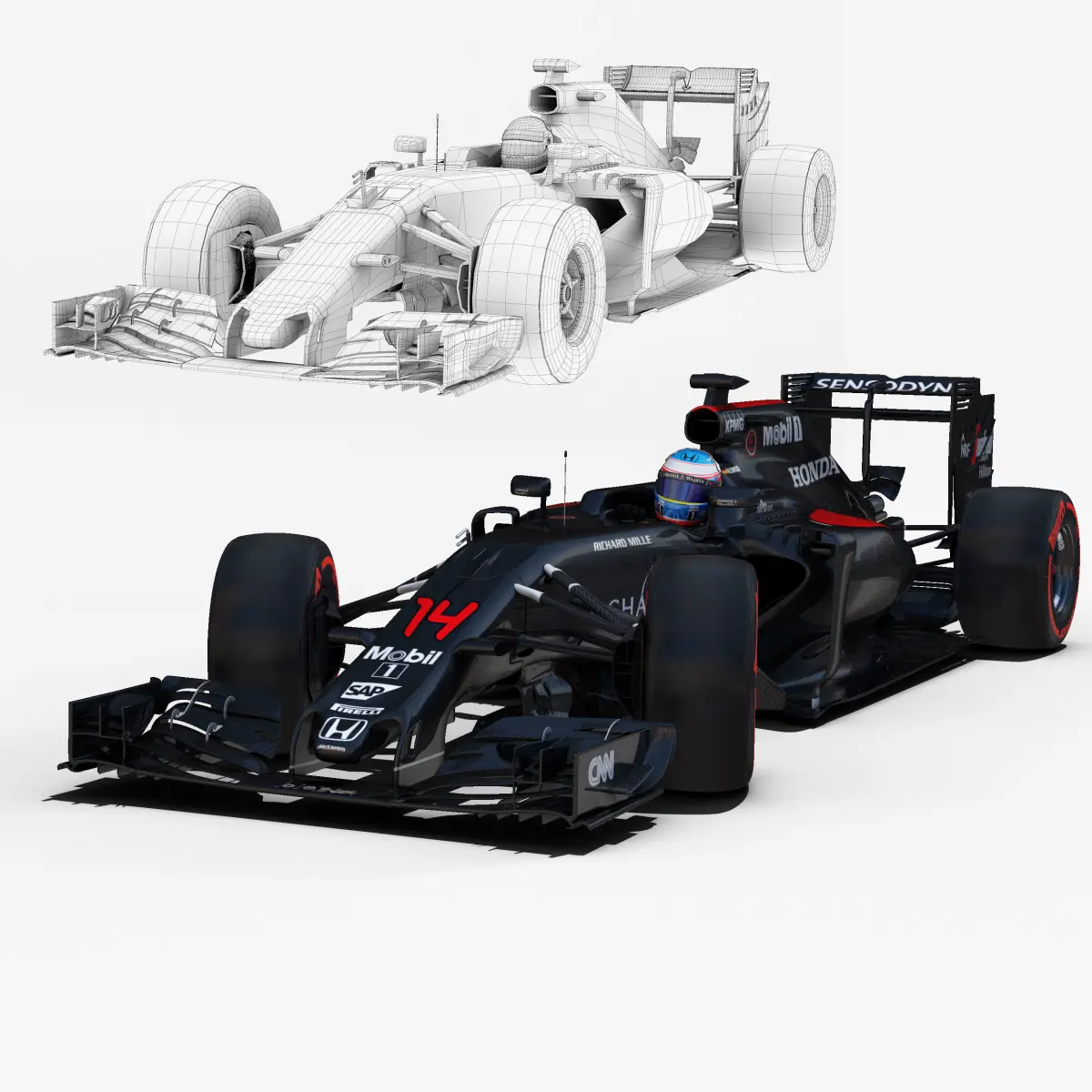 This is a 3D low poly model ,it was designed to provide a high definition in a low poly. Standard low-poly mesh with specific poly count. It`s the most accurate and realistic McLaren Honda MP4-31 of the market.It has all of details of Mp4-31 model. Rigged in the maya version. This is a recreation of McLaren Honda Mp4-31 model,it can suffer modification over the season.Included all types os wheels, Fernando Alonso and Jenson Button, theirs helmets and the steering wheel.The model is completely ready for use visualization in maya. For low poly model simply press 1 and for the high resolution press 3. In Cinema4d go to function menu and subdivide. In 3dmax meshsmoothIn the low poly: Poly count : 90510 Vertex count : 94752In the high poly: Poly count : 1477688Vertex count : 1494721Textures included. Each texture is in jpg format and have a 4K texture resolution for high quality It has three UV textures, one for the car , other for the tires and the last one for the driver. It has color textures, specular textures, displacement textures,bump textures.The files are obj, fbx, mb ,c4d and 3DS.Included 7 different poses of each driver.In formats c4d, 3ds, obj and fbx model exported to standard materials (textures), not contain mental ray shaders. files with the model does not contain extraneous or hidden objects (lights, cameras, etc.) Included rigging and constrains, blend shapes and driven keys only in the maya format.In the maya format you can easily change the wheels, the pilot and the DRS(open and close).original file format maya render in linear sRGB