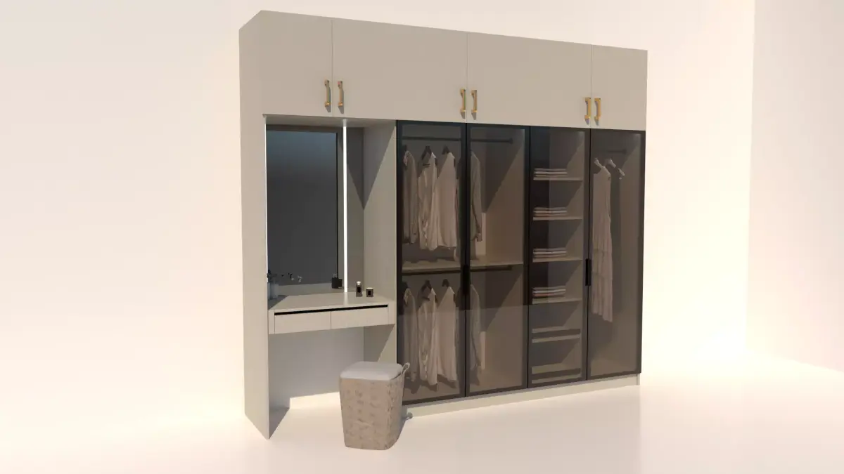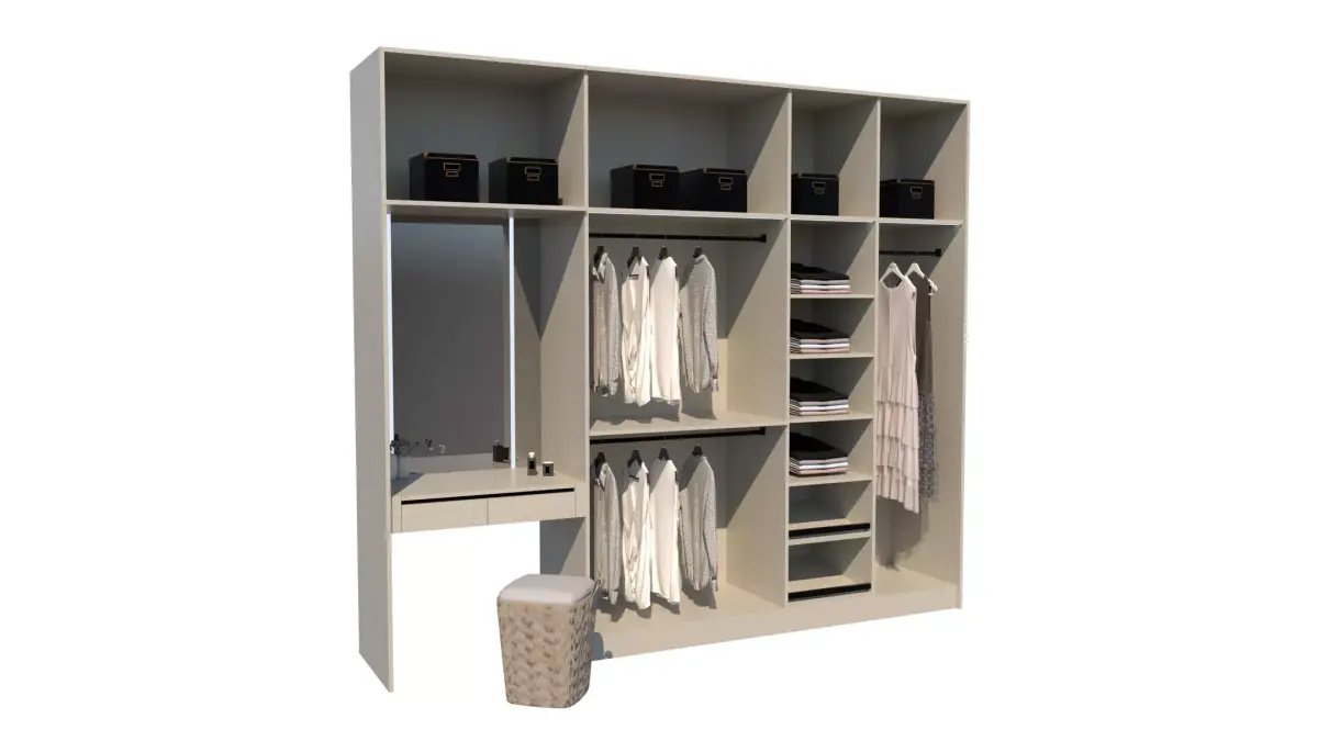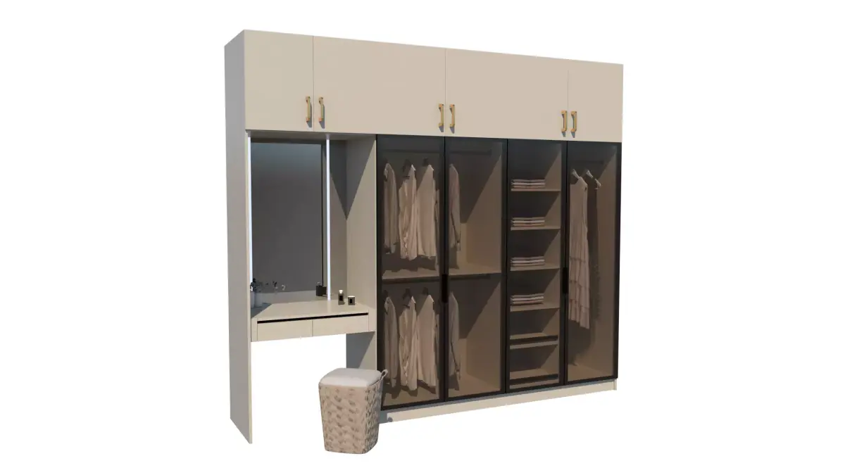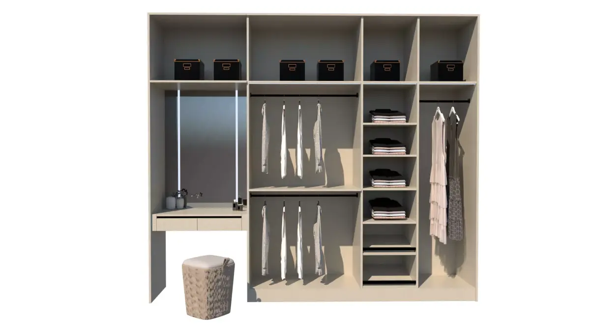This high-quality 3D model features a sleek and contemporary wardrobe design with a built-in vanity area. The wardrobe includes multiple compartments, shelves, and hanging rods for efficient storage. The vanity area features a mirror and a stool, providing a convenient space for grooming. The model is ideal for interior design projects, architectural visualizations, or product presentations.