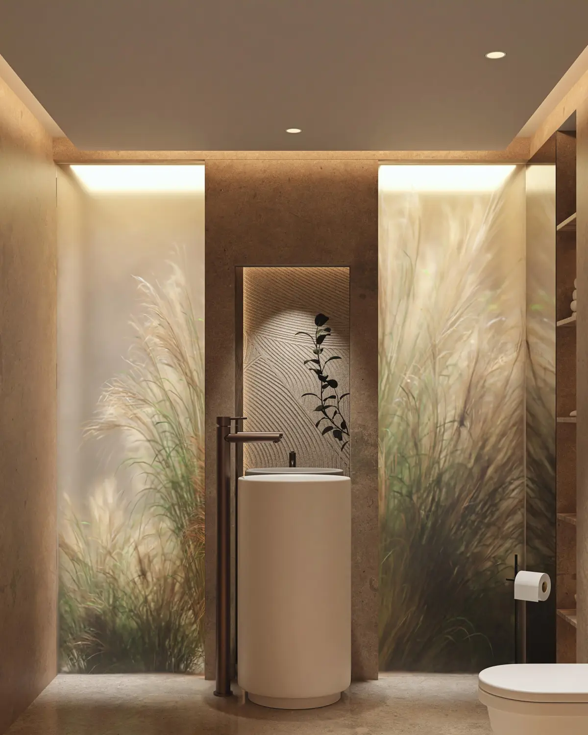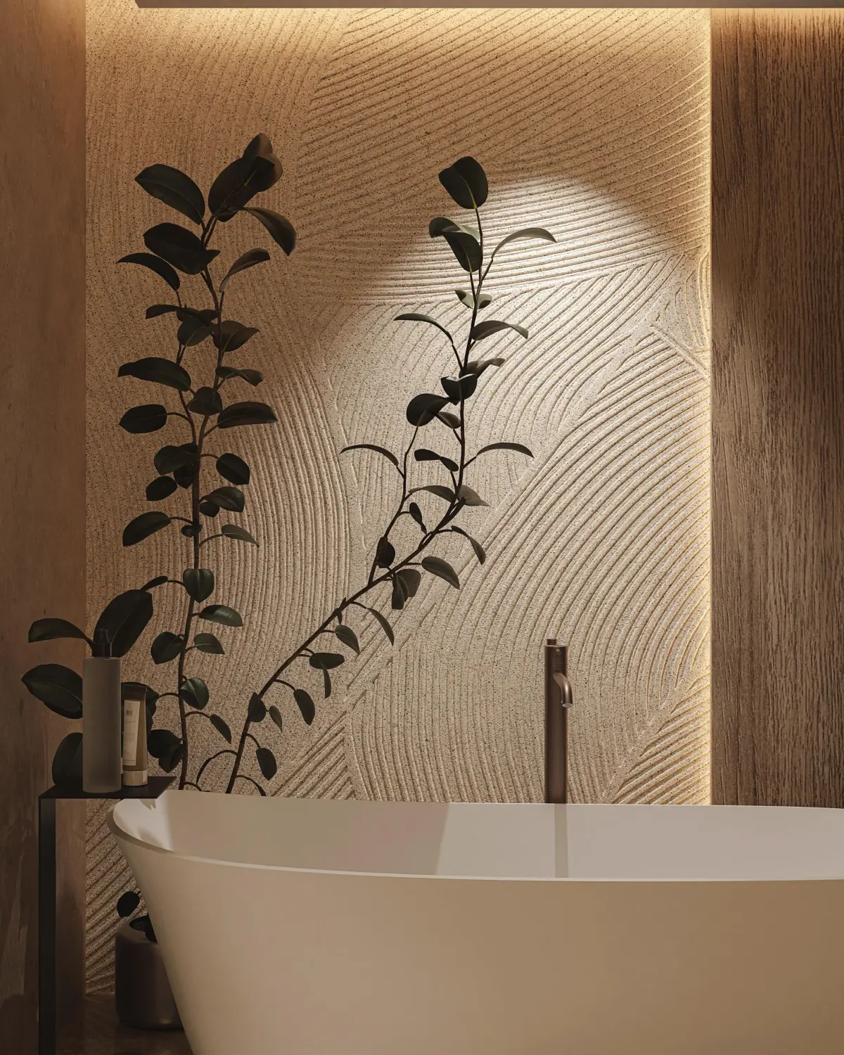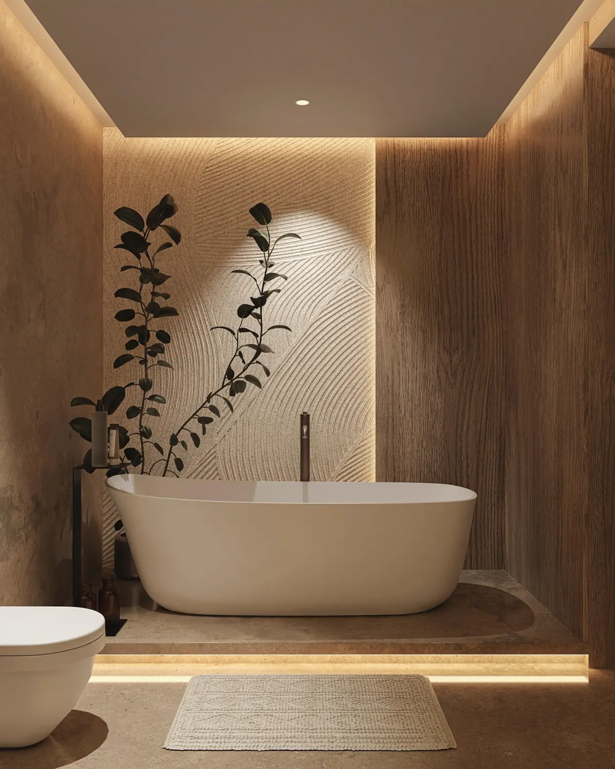 Transform your bathroom into a personal spa with this design. Featuring a freestanding bathtub as its centerpiece, complemented by warm lighting and natural textures, it's an oasis of calm and relaxation. Ideal for those seeking a serene and luxurious bathroom experience.