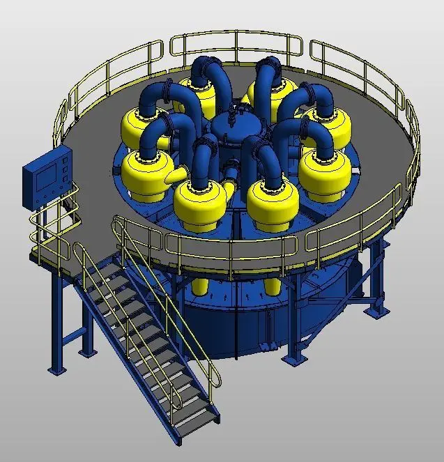 A different description: A hydrocyclone is a mechanical device designed to reduce or increase the concentration of a dispersed phase, solid, liquid or gas of different density, by means of centripetal forces or centrifugal forces within a vortex.[1]