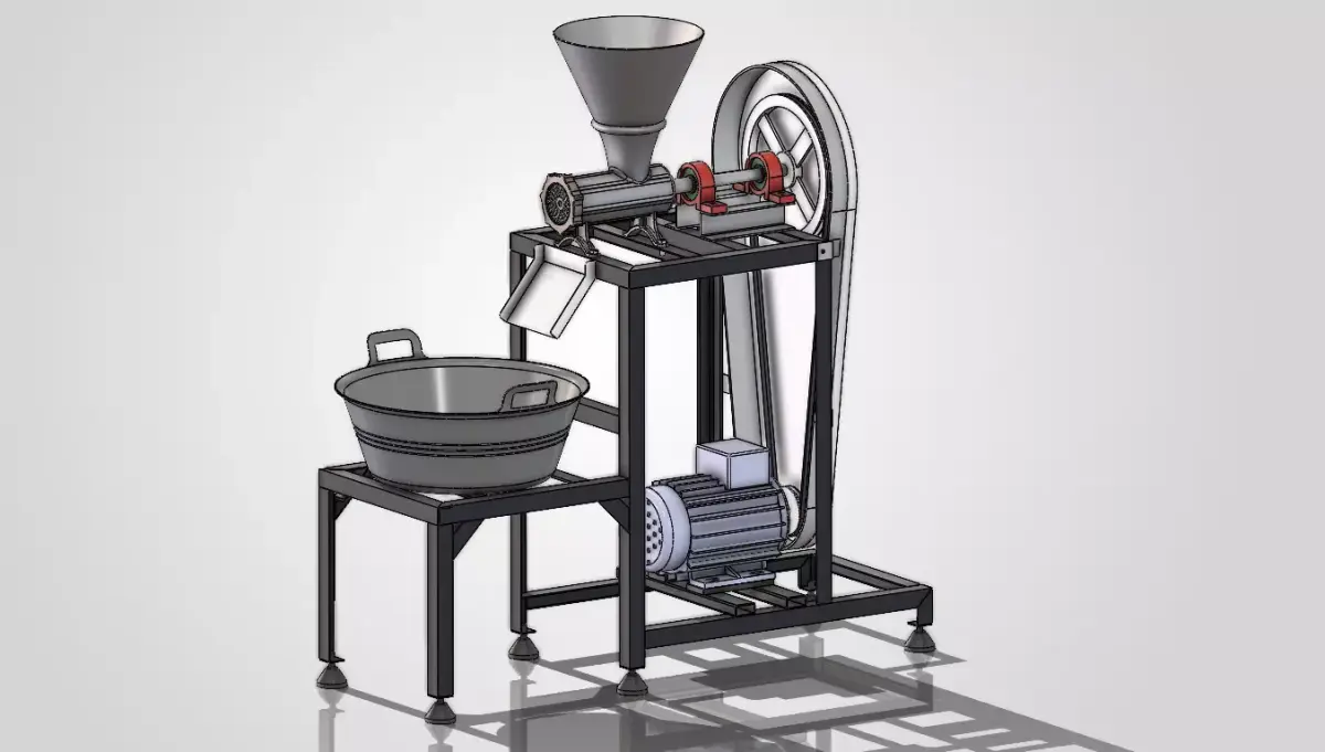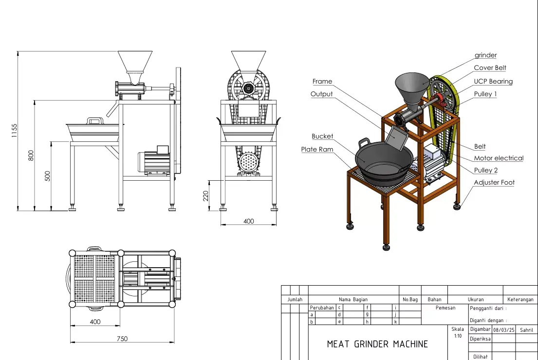 This model represents a functional industrial meat grinder machine, specifically designed for processing fish and meat for traditional Indonesian food production such as pempek.