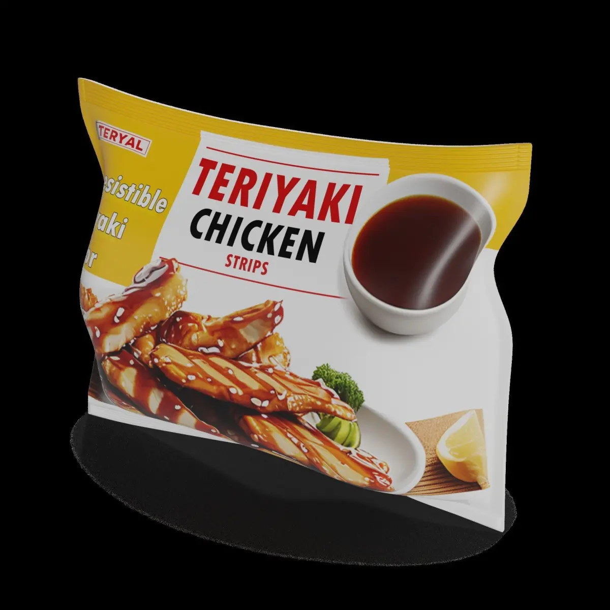 Teriyaki Chicken Strips: Indulge in the sweet and savory flavors of our teriyaki chicken strips. Made from tender chicken breast, our strips are marinated in a delicious teriyaki sauce and grilled to perfection. Packaged in a vibrant and colorful bag, our teriyaki chicken strips are a convenient and tasty snack option. The packaging features a Japanese-inspired design, with a picture of the chicken strips and a label that reads Irresistible Teriyaki Flavor to highlight the unique taste of the product.