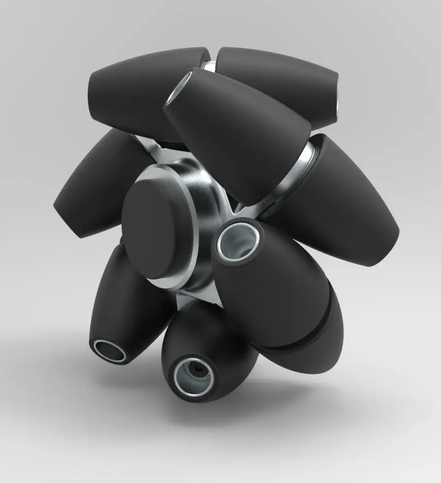 The Mecanum wheel is a design for a wheel which can move a vehicle in any direction. It is sometimes called the Ilon wheel after its Swedish inventor, Bengt Ilon, who came up with the idea in 1973 when he was an engineer with the Swedish company Mecanum AB.It is a conventional wheel with a series of rollers attached to its circumference. These rollers typically each have an axis of rotation at 45° to the plane of the wheel and at 45° to a line through the centre of the roller parallel to the axis of rotation of the wheel. Moving all four wheels in the same direction causes forward or backward movement, running the wheels on one side in the opposite direction to those on the other side causes rotation of the vehicle, and running the wheels on one diagonal in the opposite direction to those on the other diagonal causes sideways movement. Combinations of these wheel motions allow for vehicle motion in any direction with any vehicle rotation (including no rotation at all).