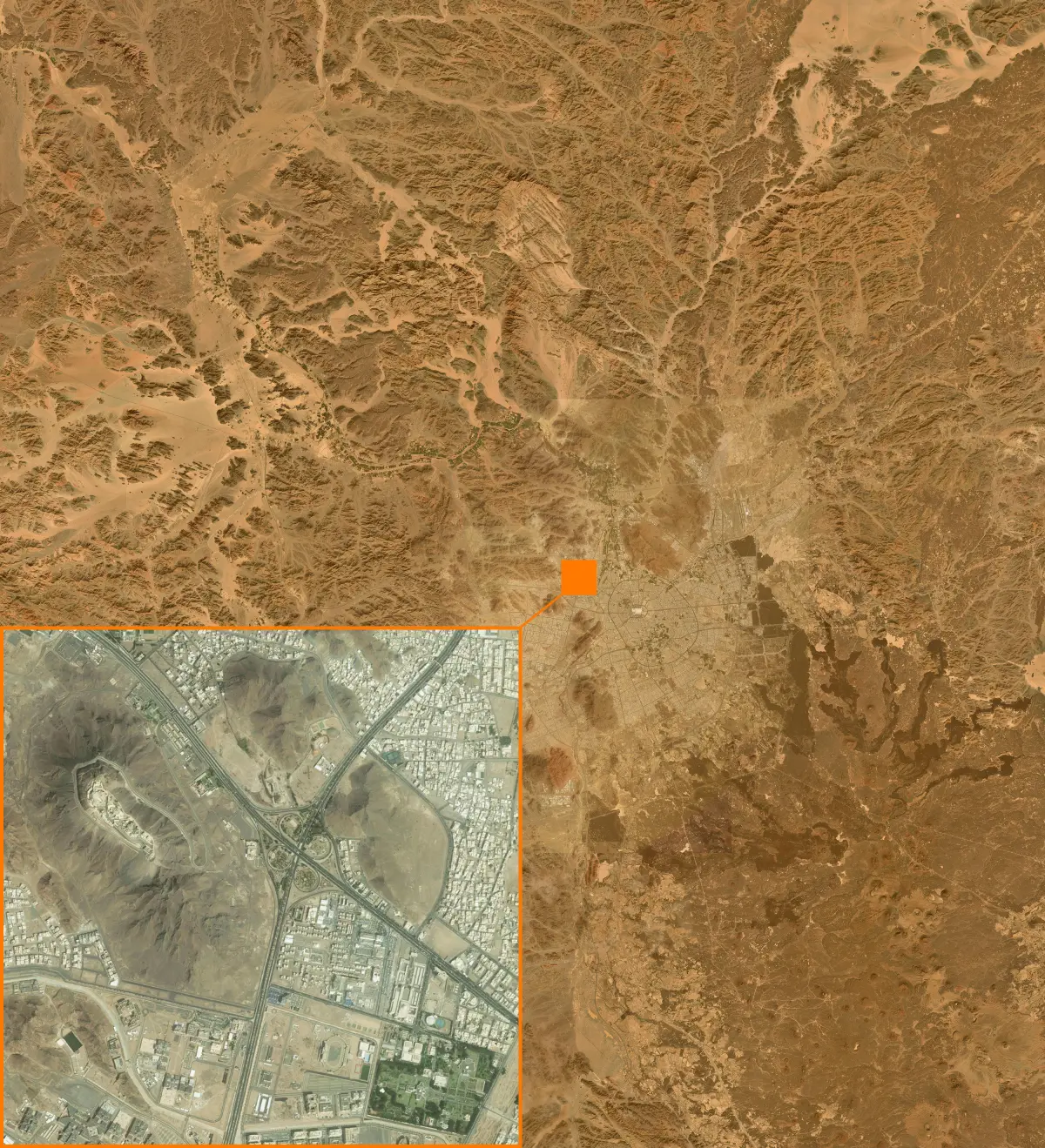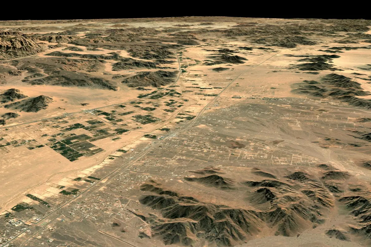 Terrain model of the Mecca region and the Red Sea coast of Saudi Arabia.