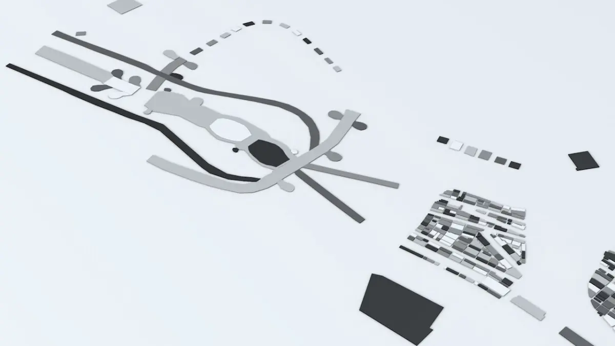 - the model is vpositioned on a flat surface (all buildings are on the “floor” - no elevation data included)