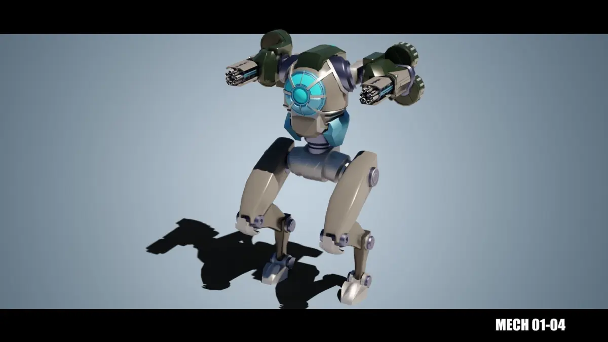 Model of a MECH character with three variations and two different weapon systems. Minigun and rpg rocket launcher.
