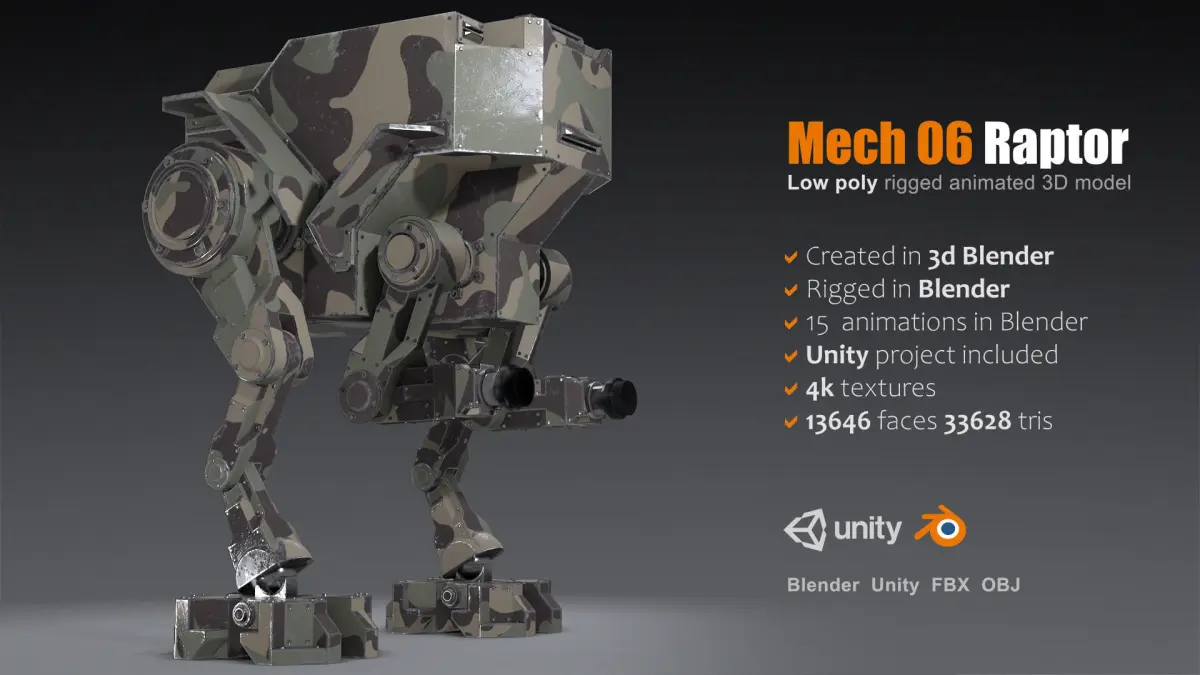 Game ready 3d model Mech 06 - RaptorThis low poly Model can be used in your game/application as well as the rest of the models from this collection. Model perfomed in Blender. Rigged and animated in Blender.Unity project with simple C# script included (for preview test only).Just run game and press Q-F keys to check animations in Unity.15 animations: