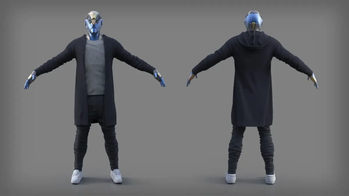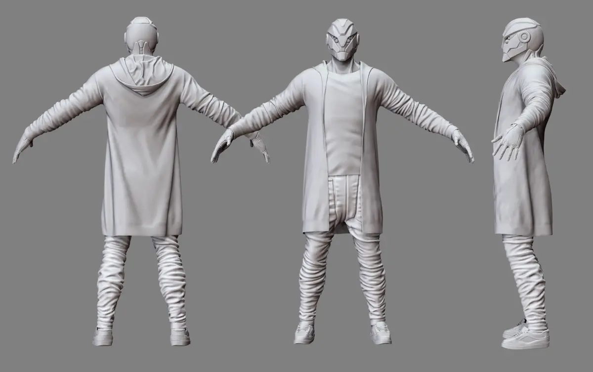 Provide highpoly shirt , jacket , shoe and trouser but the head and arm are cut from the inside .