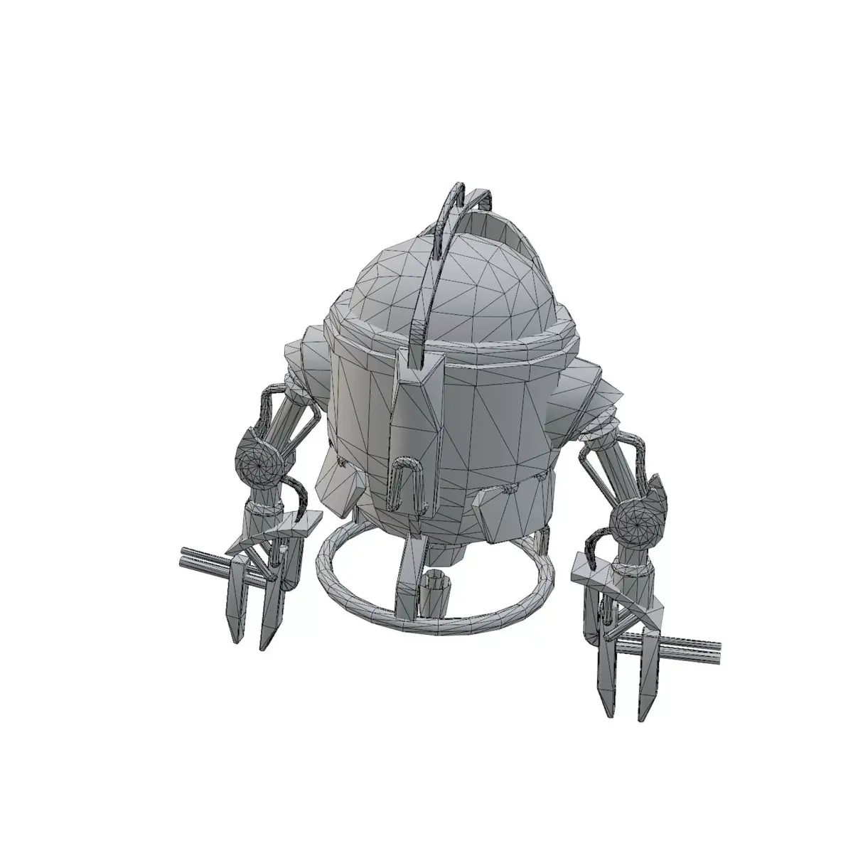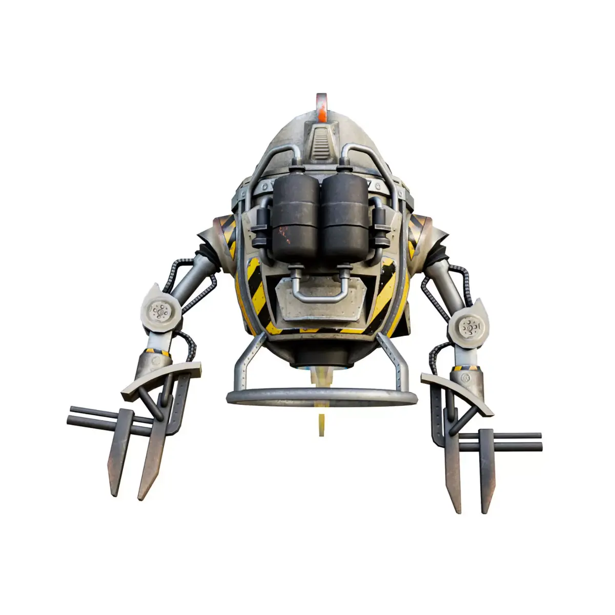 This is a sci-fi-style small robot with a dome-shaped head, yellow-and-black industrial paint, mechanical arms with gripping claws, and warning signs on its body, giving it a worn, rugged mechanical texture.