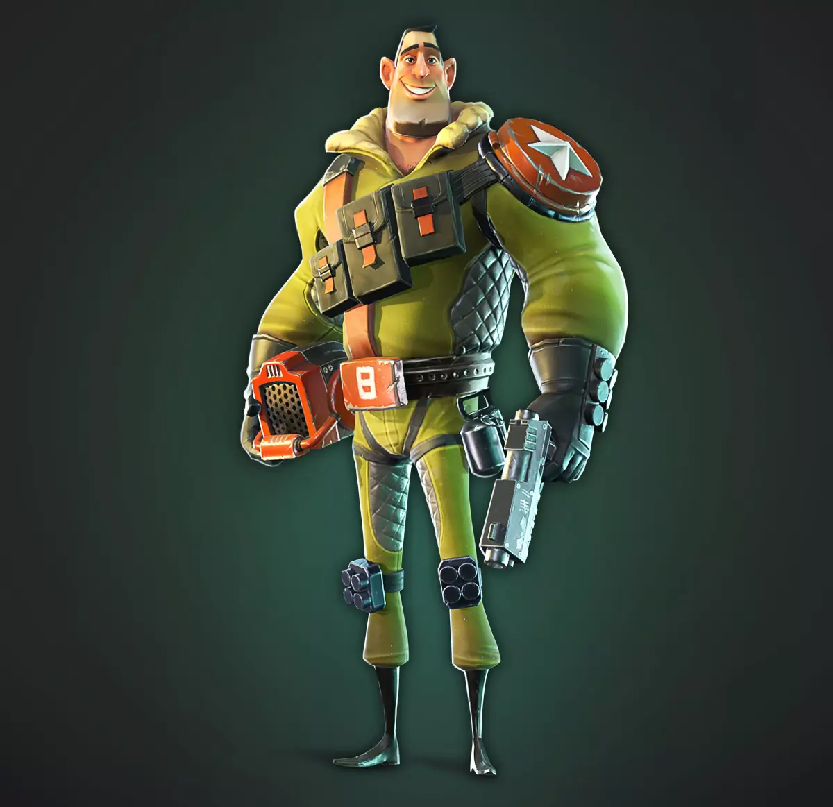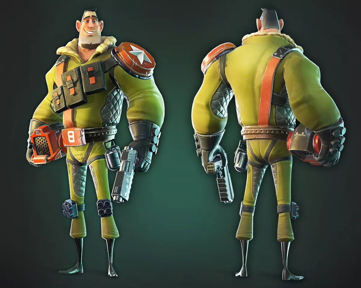 This is a stylized 3D character model of a Mech Pilot, featuring a muscular and robust design. The character is equipped with a futuristic helmet and a weaponry, such as a gun. The model includes high-quality 1K texture sets and a detailed wireframe view. With its cartoonish aesthetic, this character is ideal for use in animated projects, video games, or any media that requires a stylized, dynamic character. The textures are optimized for use in various 3D applications