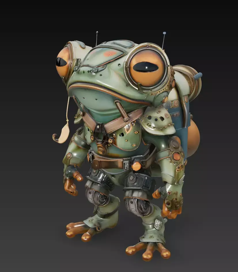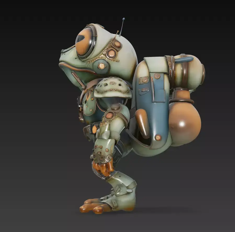 The design blends organic frog anatomy with advanced mech engineering, featuring bolts, pistons, armor plates, tubing, and small surface details that make the model visually rich from every angle.