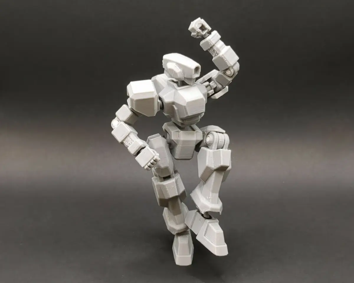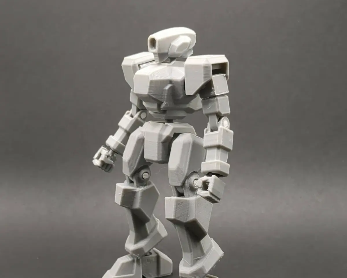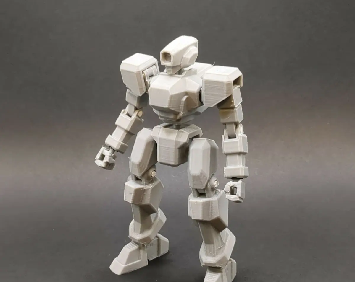 3d printed mecha model. I made this as a test for 3d printing TPU polycaps for articulated joints. These models are intended to be printed on a filament printer. Files meant to be printed in TPU are labeled as such in the file names. Several parts are symmetrical and require 2 per complete model. Parts that need not be printed twice are the head, chest, waist, and left and right hands and thighs. None TPU prints will require supports in order to print properly. Joints for the Elbows, Knees, Shoulder, and Pauldron Mounts will require 3mm polystyrene rod or 3mm filament to fit through the hole to assemble. Glue is required for the pauldron to stick to its mounting.