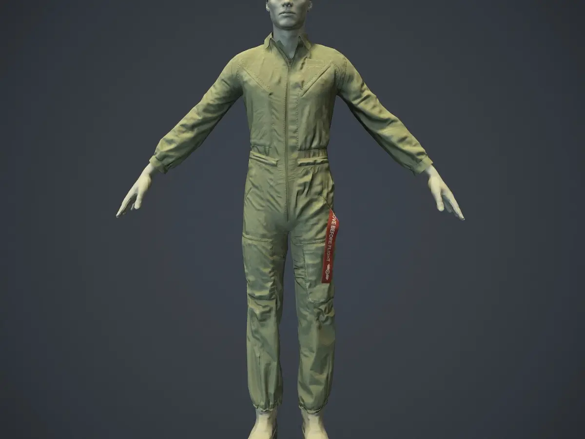 The actual mesh is mostly quads and contains 5,076 faces and 5,147 vertices. If converted to tris, the mesh is about 10K tris. Zipper, red remove before flight tag and inner zipper collar are separate objects from the main suit. They can be rigged separately or removed altogether.