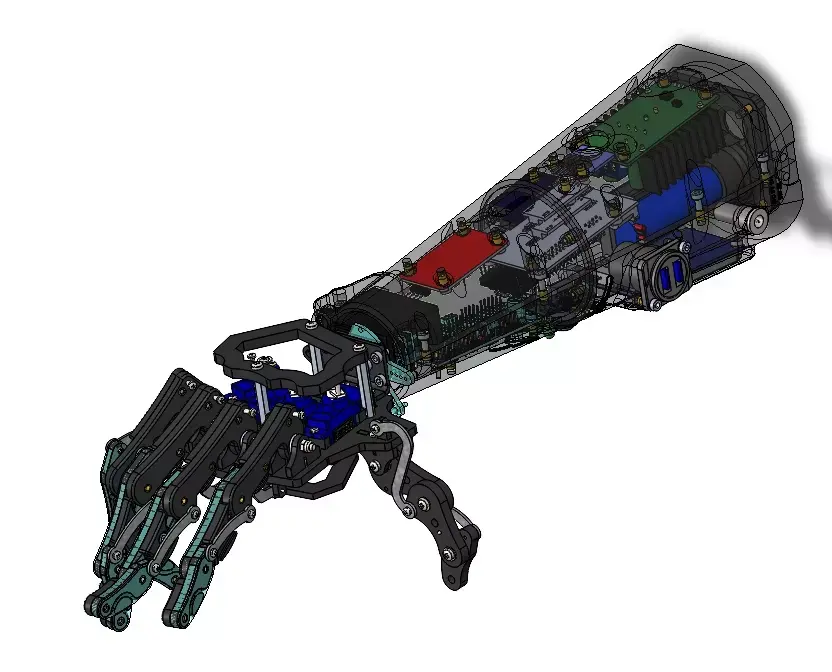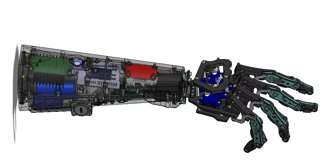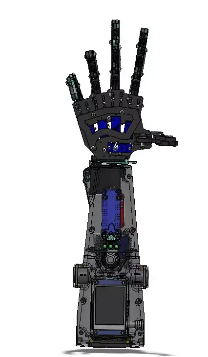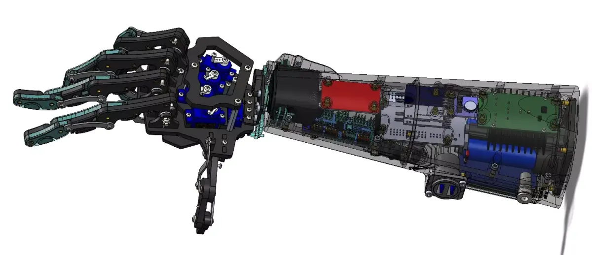 - Core Structure and Function2.1 Hand ActuatorAnthropomorphic Finger Structure: The bionic hand is designed with 5 fingers (thumb, index finger, middle finger, ring finger, little finger) that fully replicate the shape of a human hand. Each finger consists of multi-segment bionic bones connected by pins, forming a multi-joint linkage structure that can simulate the natural bending and stretching of a human hand, adapting to the grasping of objects of different shapes and sizes.Thumb Opposition Mechanism: The thumb is equipped with an independent opposition structure, which can perform opening, closing and pinching movements, which is the key part to achieve precise clamping and stable grasping.2.2 Drive and Transmission SystemIt adopts a rear-mounted drive layout as a whole. The motors and transmission components are integrated inside the forearm, making the hand shape closer to a real human hand and more concise and aesthetic.The fingers mainly use tendon ropes (steel wire ropes) and pulleys for transmission. The fingers are bent and stretched by motor traction, with high transmission efficiency and compact structure. The wrist can perform pitching and rotating movements, further improving operational flexibility.