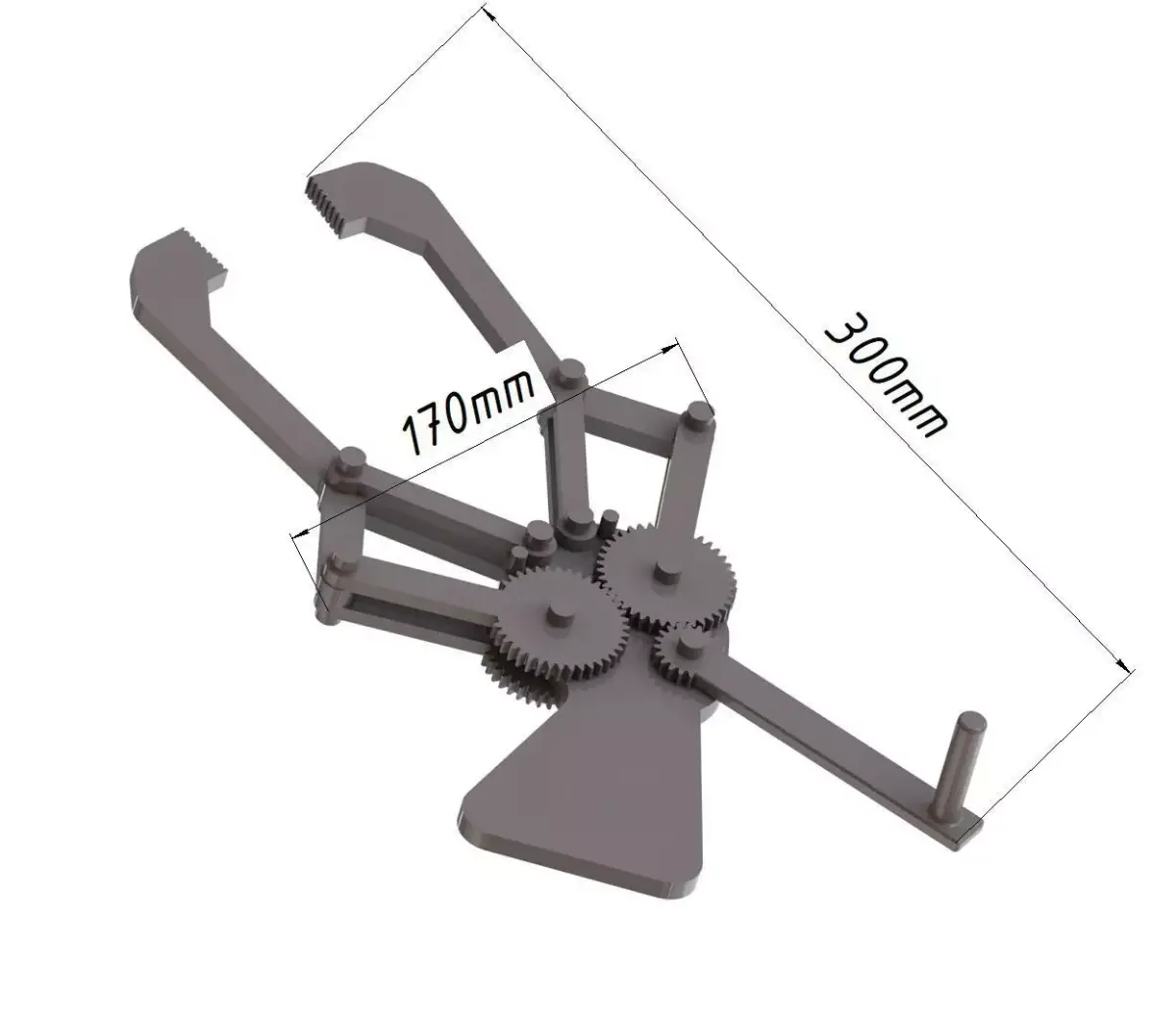 This is a mechanical gripper mechanism designed as a functional and demonstrational 3D model. The design includes a flat base platform on the lower left side, allowing the model to be comfortably held with fingers during operation. A built-in handle integrated directly with the drive gear enables smooth manual actuation and clearly demonstrates how rotational motion is converted into synchronized gripping movement. All joints and pivot points are designed so the assembly can be made using standard M5 bolts, washers, and nuts, making the model practical for real mechanical assembly.