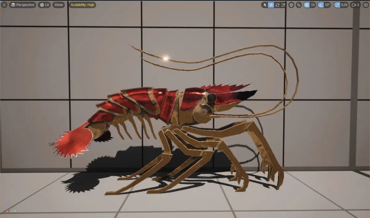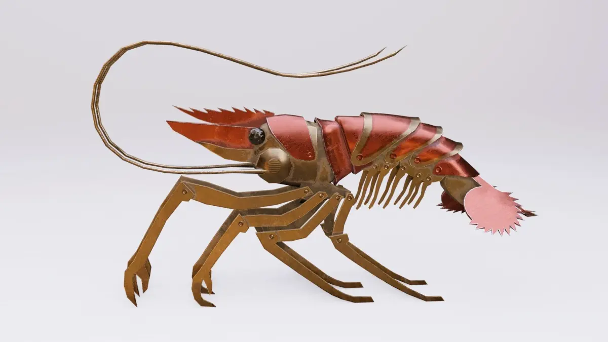 A low-poly model of a mechanical shrimp game-ready. It was created as a small enemy for my steampunk game, but our team broke up. Now I have cleaned up the model and present it to you. Available PBR textures of 2k expansion (1k textures are also available in a separate archive) in a set of both standard PBR and Unreal occlusion - roughness - metallic in one map.LOD 0 - 5082 triangles, 2806 verticesLOD 1 - 2401 triangles, 1390 verticesThere is a cyclic animation of walkinginverse kinematics is configured in the Blender file for easier animation. Round tail controller is rotation controlled, allowing you to twist the tailСube controllers in front of the whiskers serve as guides. All other controllers on inverse kinematics.