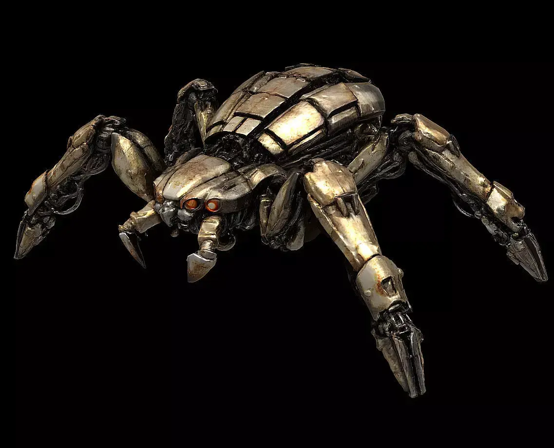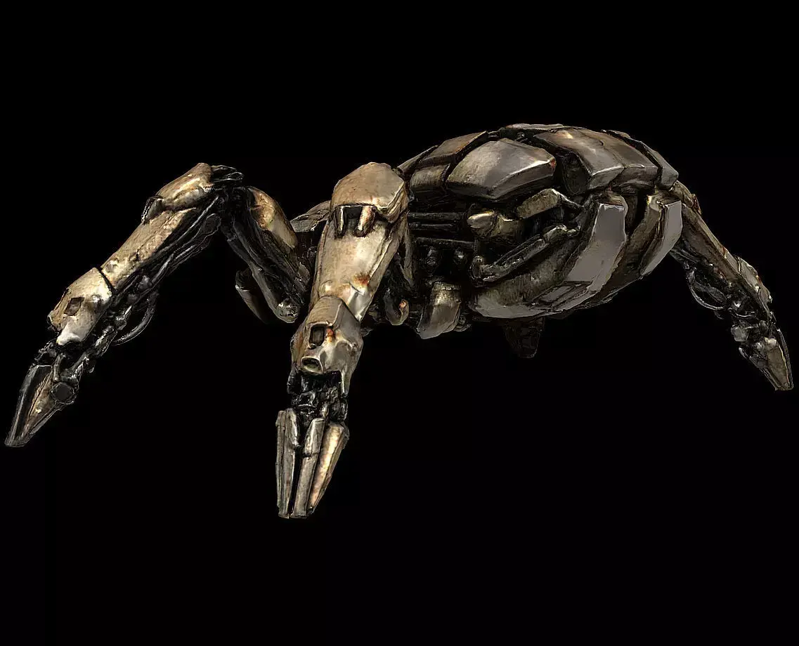 A highly detailed mechanical spider model designed as a post-apocalyptic autonomous combat creature.This intimidating mechanical arachnid blends industrial engineering with predatory insect anatomy, creating a menacing silhouette suited for dark sci-fi worlds, ruined future settings, and mechanical creature designs.