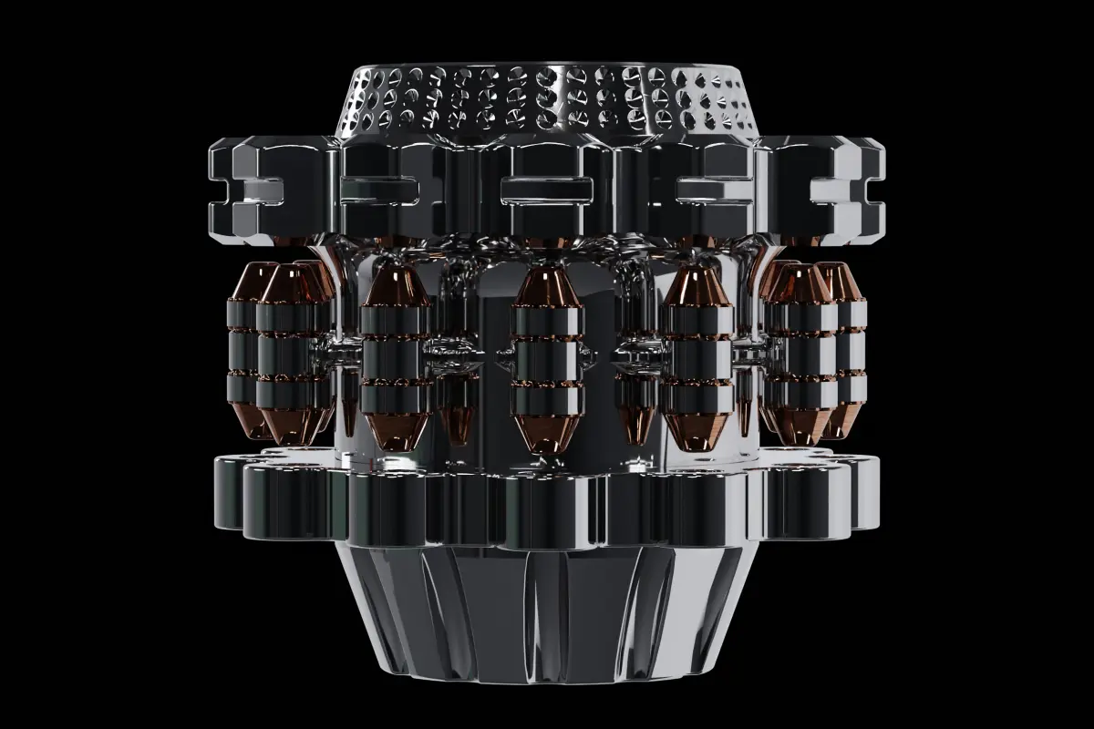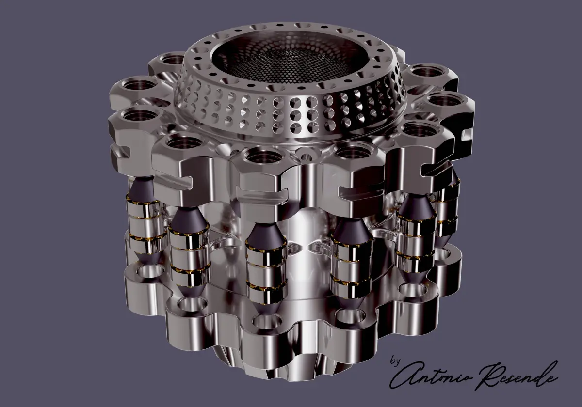 This high-detail, non-functional 3D model is a visually striking concept piece inspired by the aesthetics of Dyson products and mechanical engineering components. Designed purely for visual impact, this object blends sleek industrial symmetry with futuristic design elements. Ideal for concept art, sci-fi scenes, animation, and product visualizations. Includes complex metallic geometry with both chrome and copper-like materials, and is perfect for close-up renders or background details in high-tech environments. The model does not represent a real machine or assembly and is meant purely for artistic or decorative use.