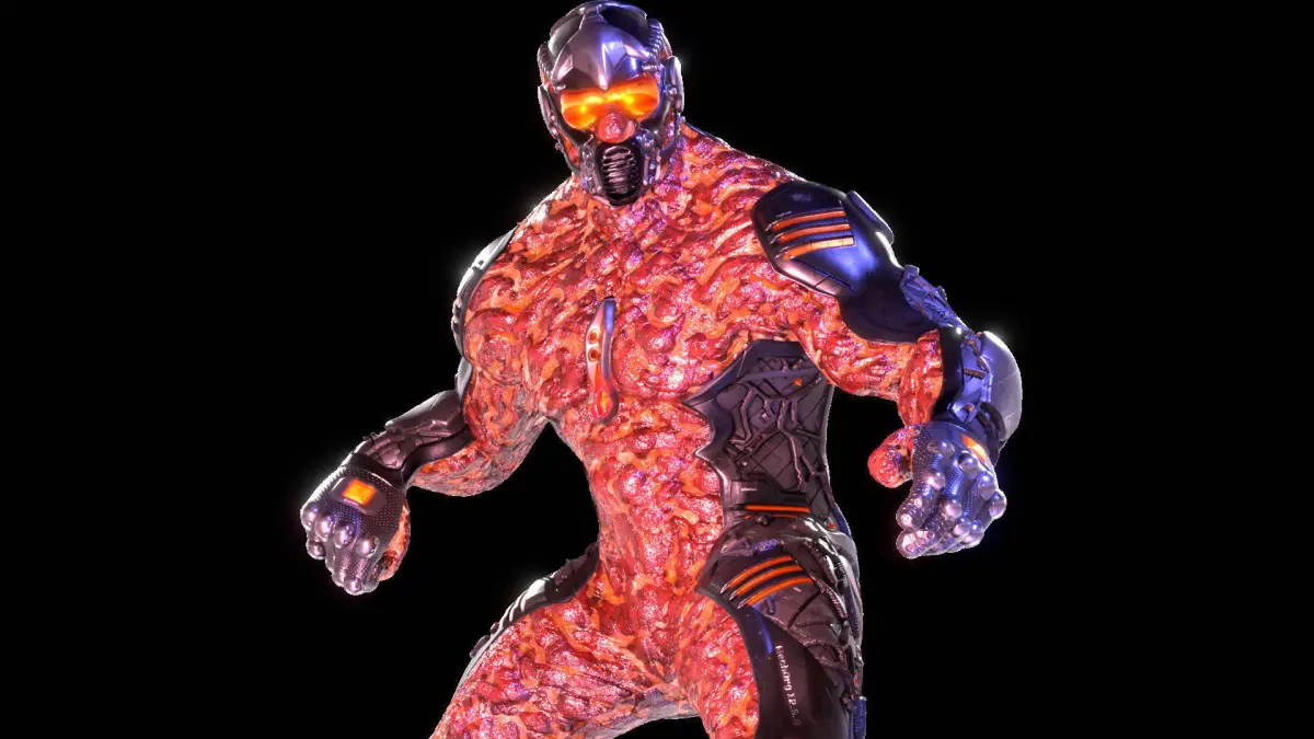 Desc._________ It's a Humanoid Cyborg Creature with augmented body parts. A tall creature with fire glowing, blood dripped flesh. Character is rigged and properly skinned for using in Game engines. It is high quality and Low poly, suitable for games. Also exported to Unreal Engine and Unity. Both packages are Provided. Provided the Blend File for customisation. Images Rendered in Cycles and Iray.