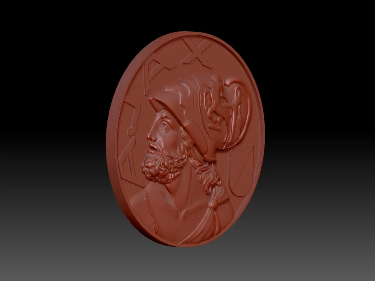 The 3D Medallion model is an antique-style profile picture of a man. AJAX's inscription is emblazoned on the medallion, and silhouettes of people can be seen on the helmet, as if in a moment of struggle. This project is great for both 3D printing and CNC machine operation.