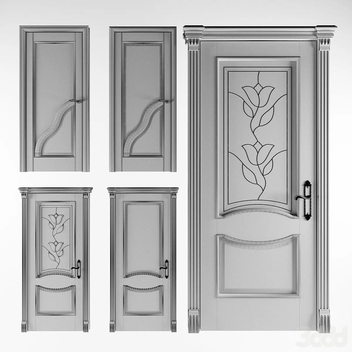 Two collections of Domberg doors in a classic style with different types of panels and sandblasted glass inserts