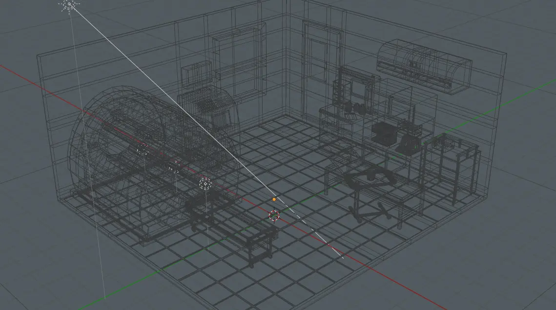 Includes room architecture, ceiling lights, floor, doors, and wall-mounted accessories