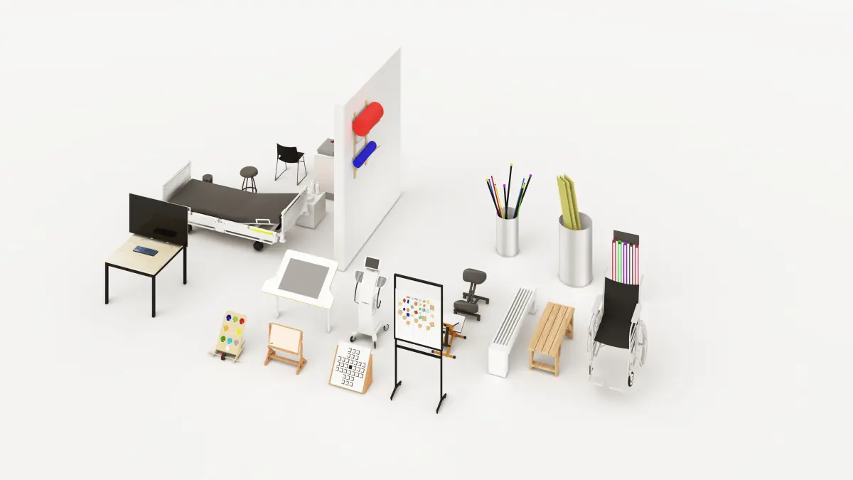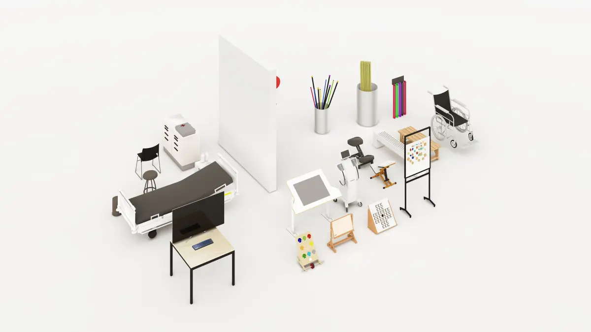 This file contains real-life modeled equipment that are used in physiotherapy (\physical and mental therapy) rooms in hospitalsThe equipment were modeled after taking pictures and measures from a visit to one of the rooms at a local hosital