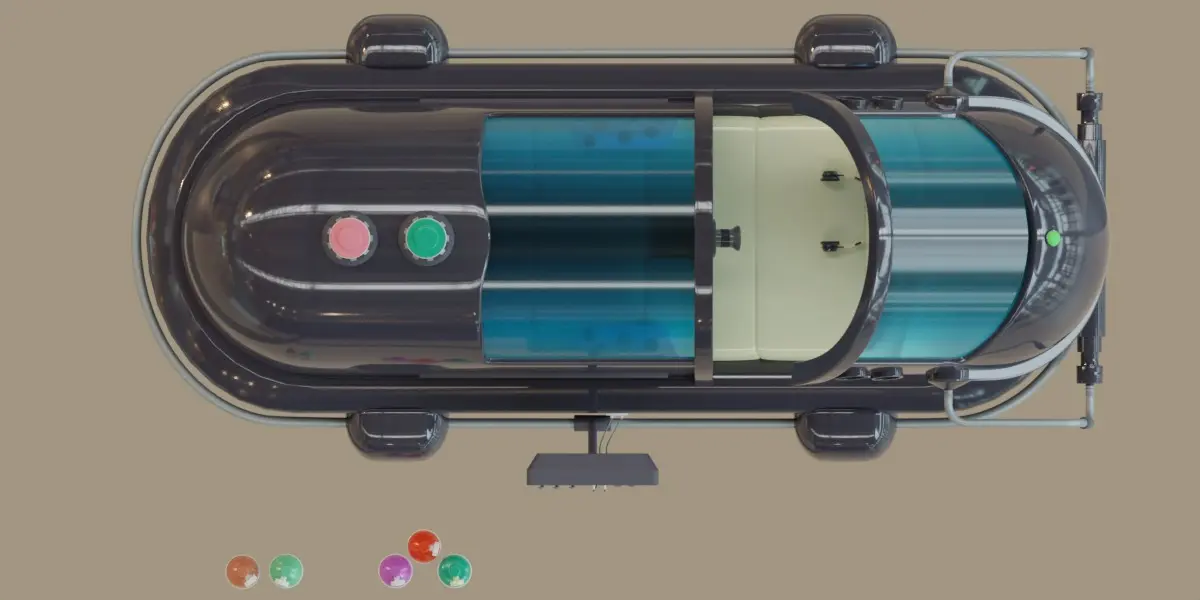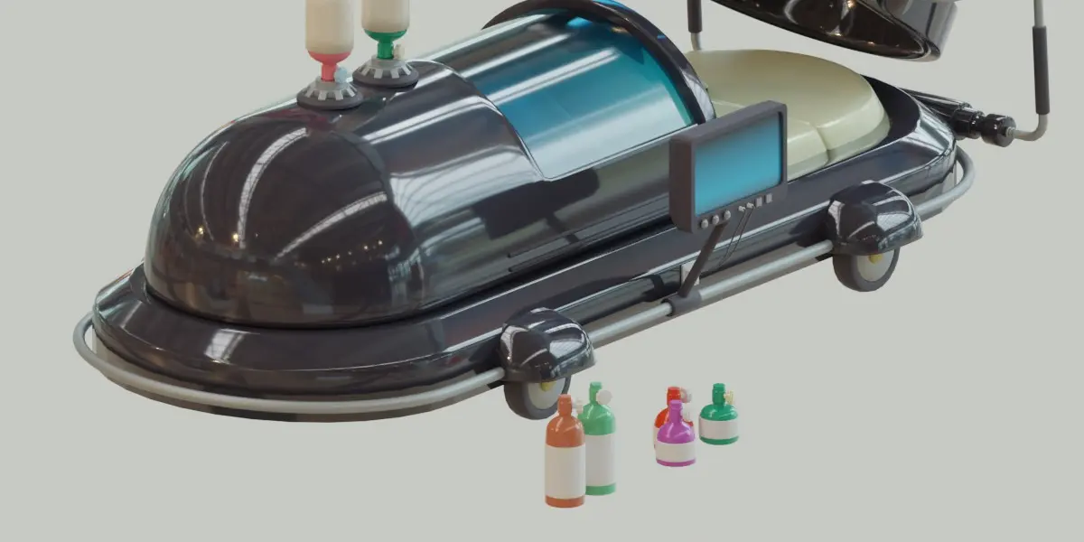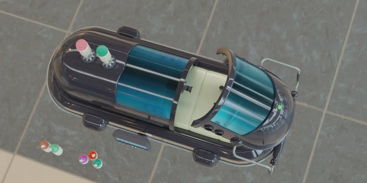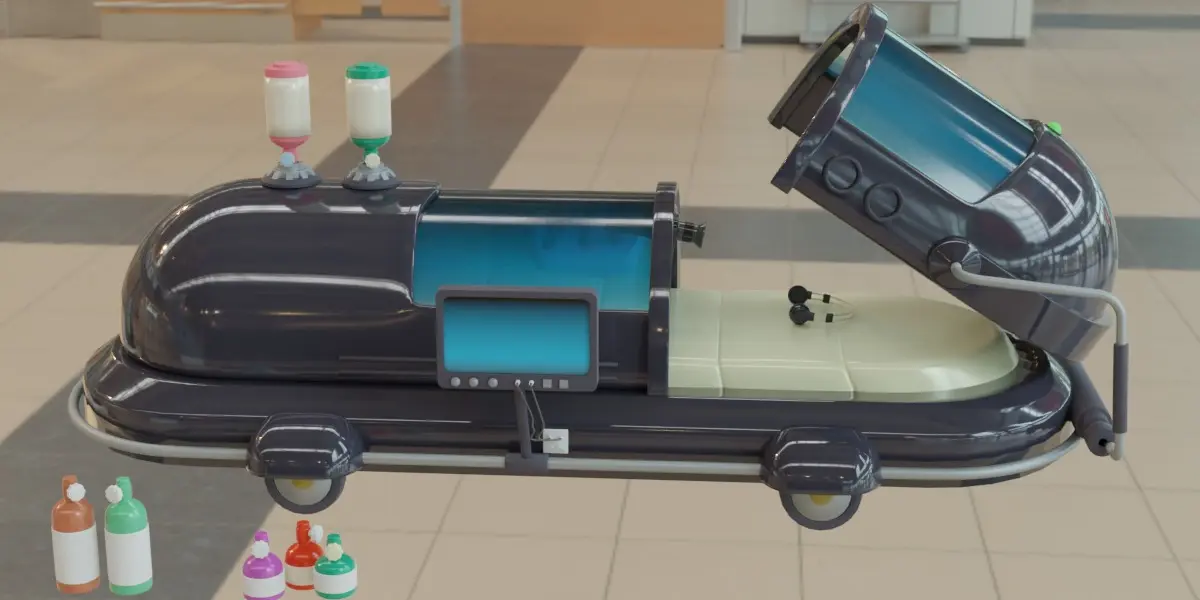 A three-dimensional model designed with Blender program that simulates an advanced treatment capsule that contains many equipment, including a computer to display all the data, as well as earphones and a surveillance camera, in addition to gas bottles designated for oxygen.This model contains several versions: