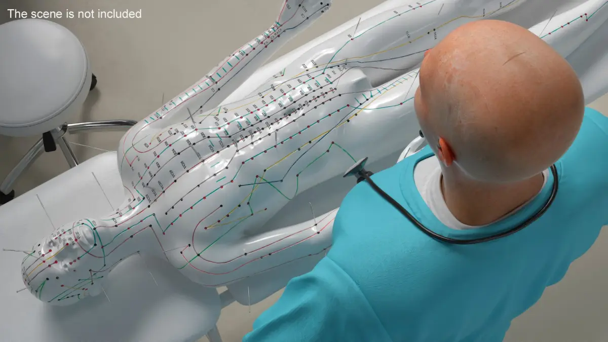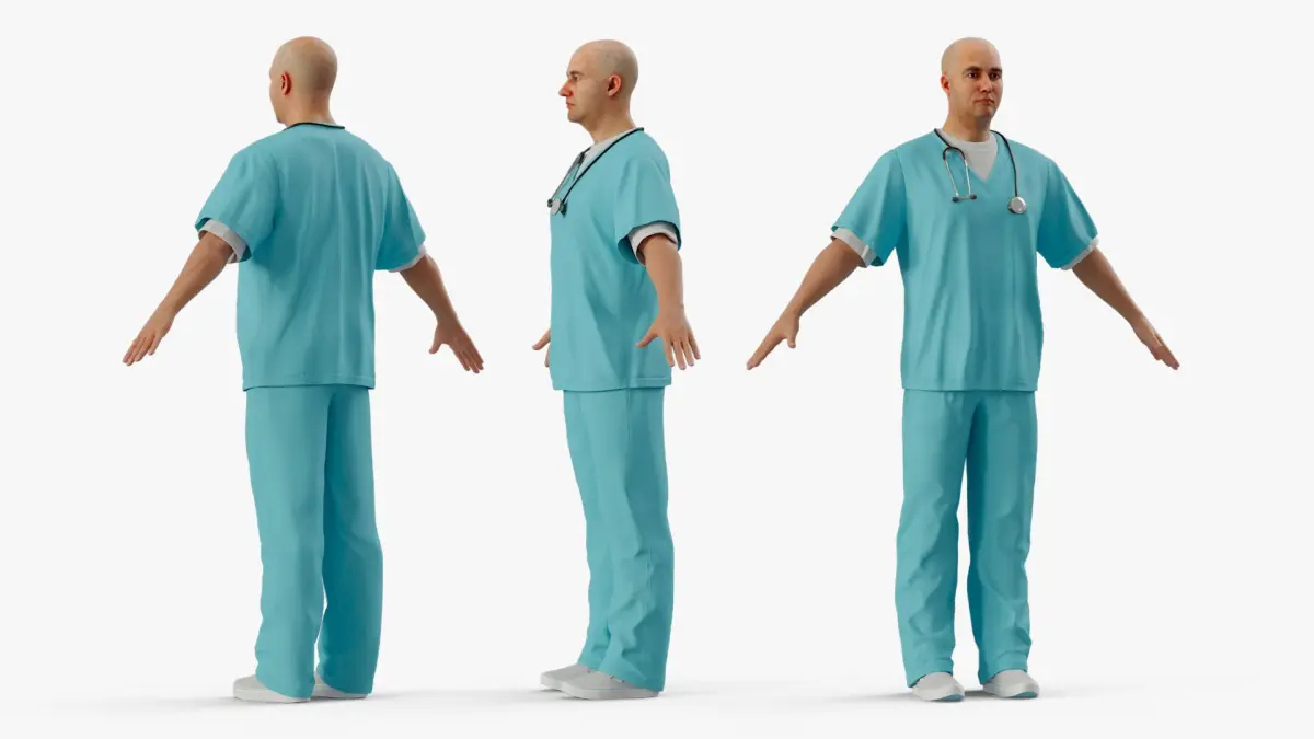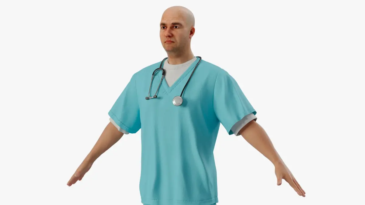 Medical Professional with Scrubs and Stethoscope is a three-dimensional model of a healthcare worker wearing a typical medical uniform and a stethoscope, illustrating a realistic representation of a medical professional in a clinical setting.