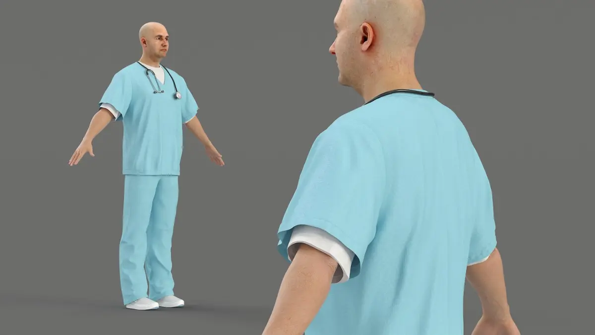 The model is dressed in a light blue scrub top and a stethoscope, reflecting the standard attire of doctors, nurses, or healthcare practitioners in hospitals and medical facilities. The realistic textures and detailed design make it suitable for various applications, emphasizing professionalism and the healthcare environment.