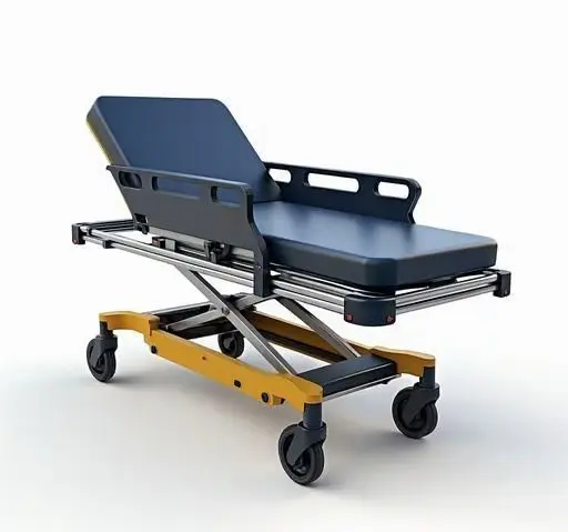 A detailed 3D model of a modern medical stretcher or gurney, designed for patient transport in healthcare settings. The stretcher features a comfortable-looking dark blue mattress and adjustable backrest, supported by a sturdy black frame with a prominent yellow base structure. It is equipped with locking wheels, side rails for patient safety, and various handles and adjustment mechanisms. The model is rendered with clean lines and a realistic finish, presented against a pure white background. This versatile medical equipment model is ideal for hospital visualizations, healthcare simulations, emergency service training scenarios, or any project requiring realistic medical assets.