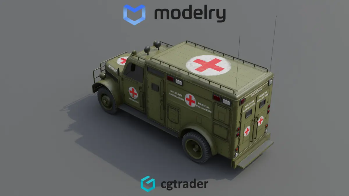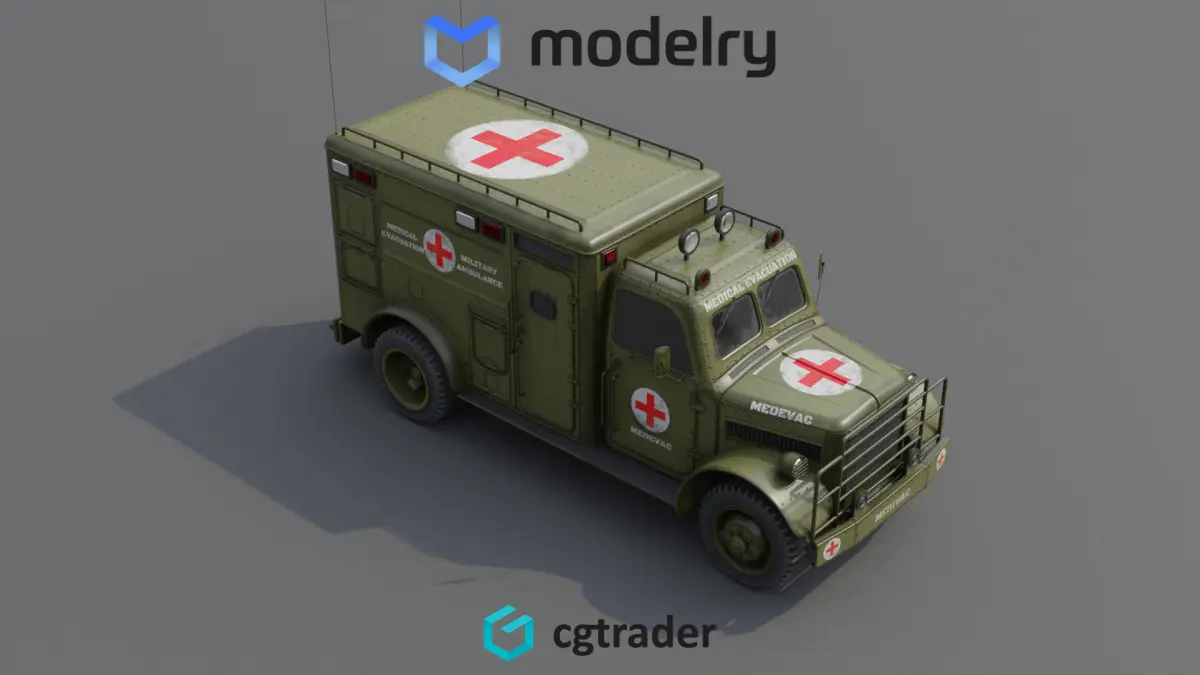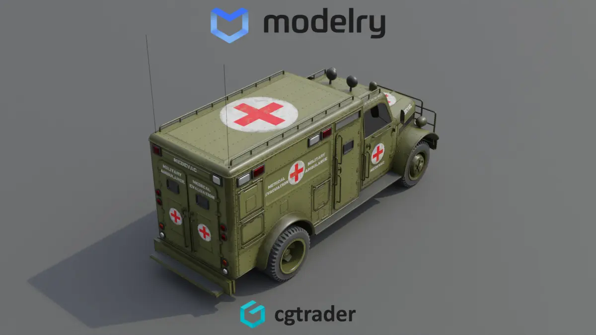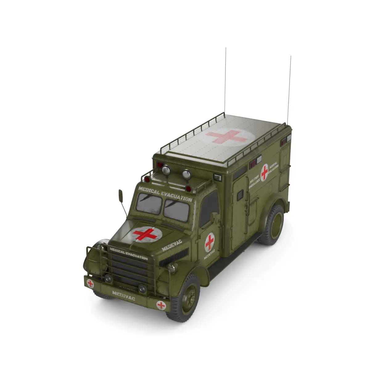 A retro-inspired medical evacuation vehicle reminiscent of mid-20th century military ambulances, featuring a classic olive green paint job with vintage medical insignia and siren, complete with wooden stretcher racks and old-fashioned medical equipment for a nostalgic touch.