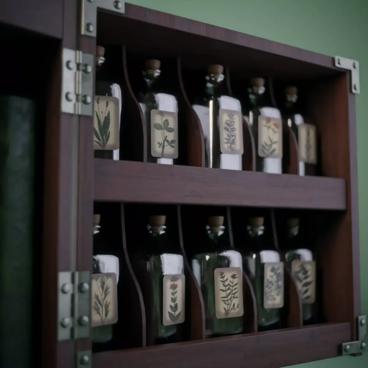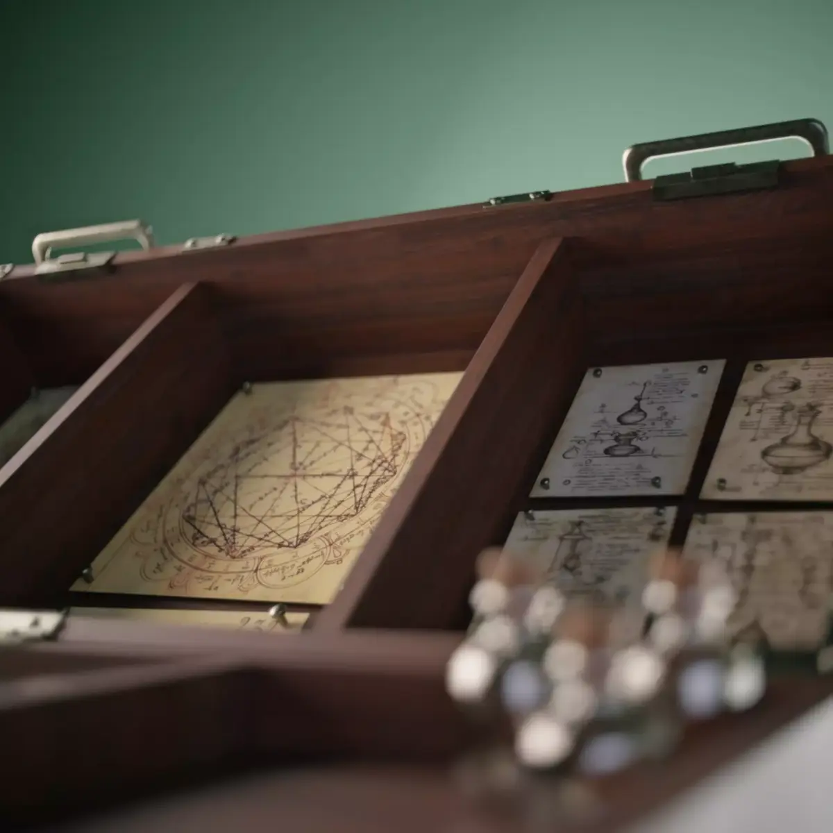 A detailed 3D model of a medieval alchemy box, designed for realistic and fantasy-themed projects. The wooden box opens to reveal multiple compartments, drawers, and shelves filled with potion bottles, scrolls, books, maps, alchemical tools, and other small props for added detail. The model features textured wood and metal parts, making it ideal for use in medieval or fantasy scenes, RPG games, animations, visualizations, or historical recreations.