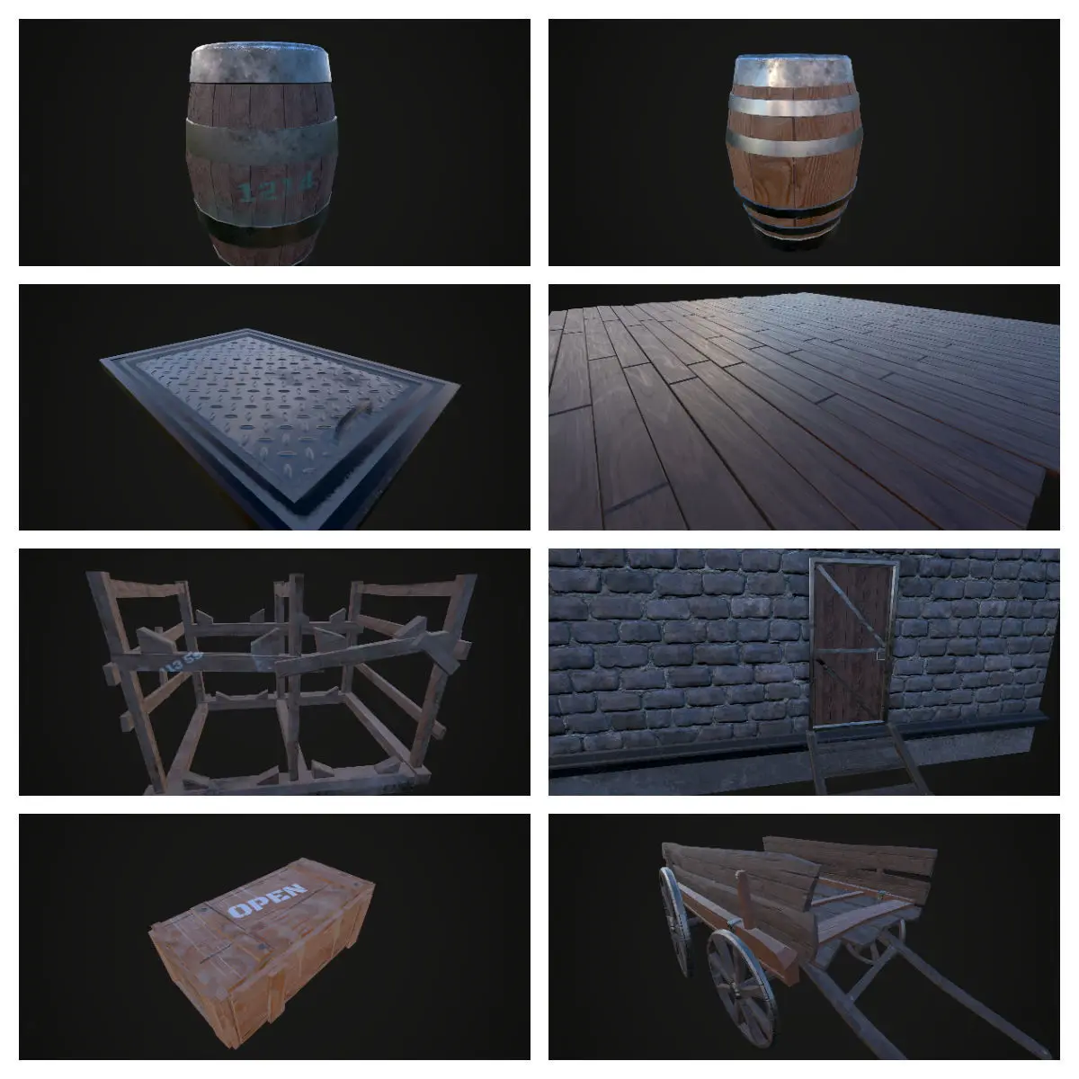 Elements:2 barrels (2k texture set)4 boxes 2kbarrel cage 1ksewer drainage 1kfloor 4kwall and door 4kwooden cart 2k
