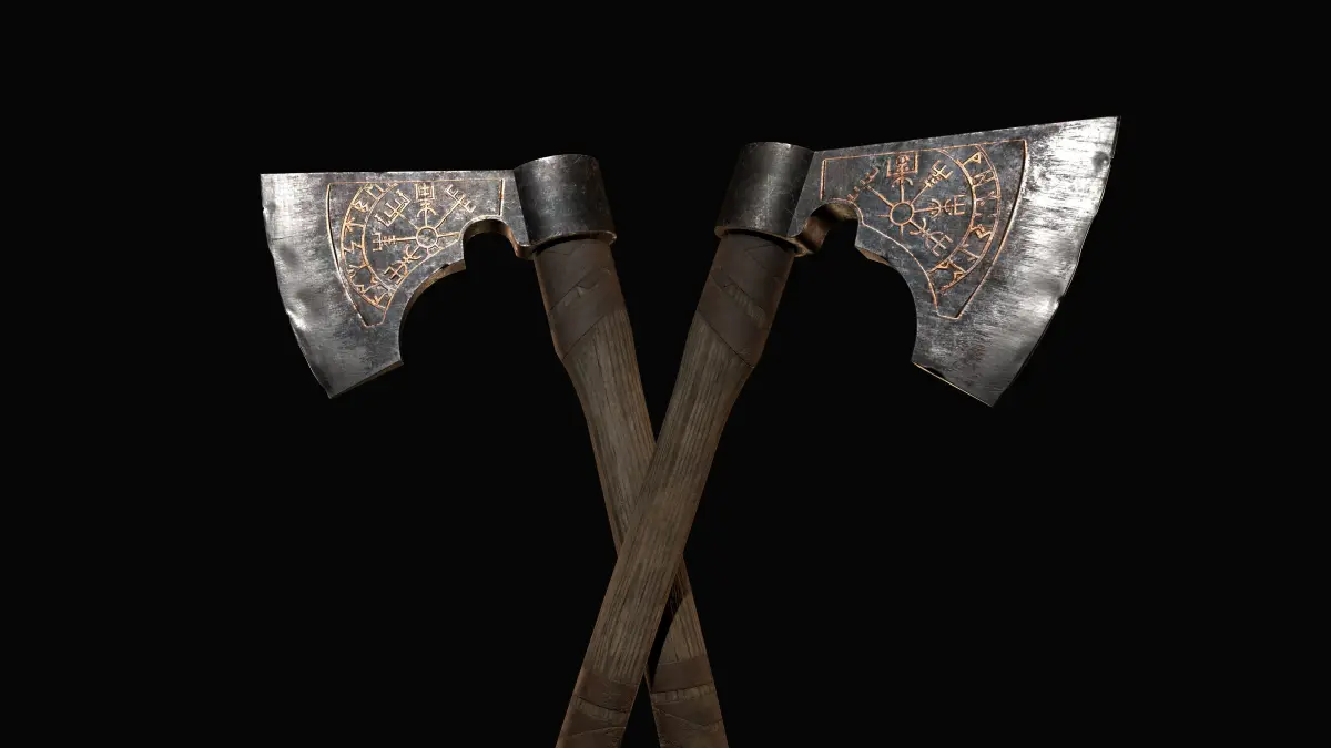 Game ready model of vikings battle axe with scandinavian runic ornament. This is high quality model with detailed textures and various small surface details such as damage, the texture of sharpened metal, wood fibers, etc.