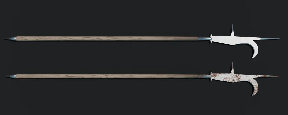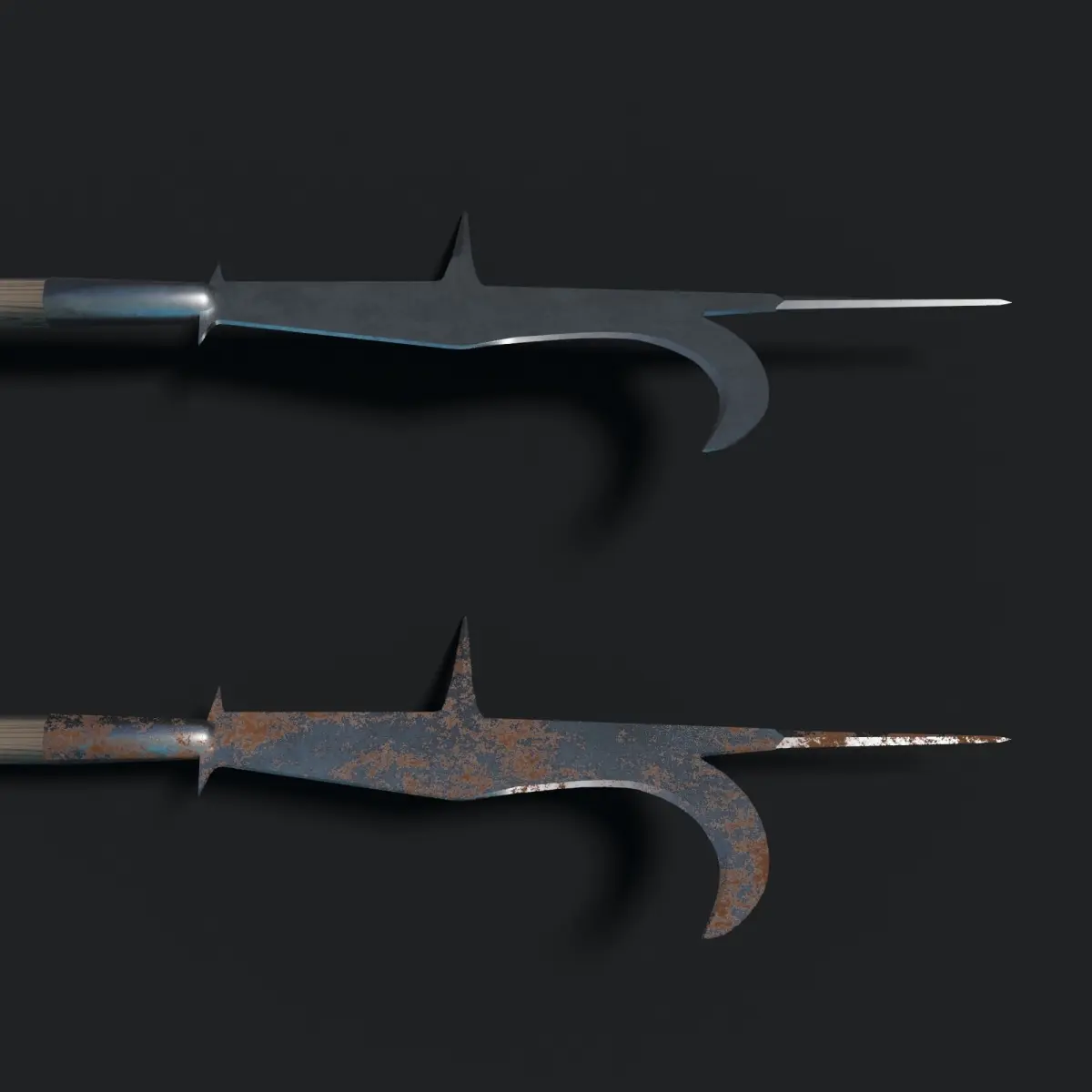 A low poly medieval bill hook model with standard steel and rusted textures.