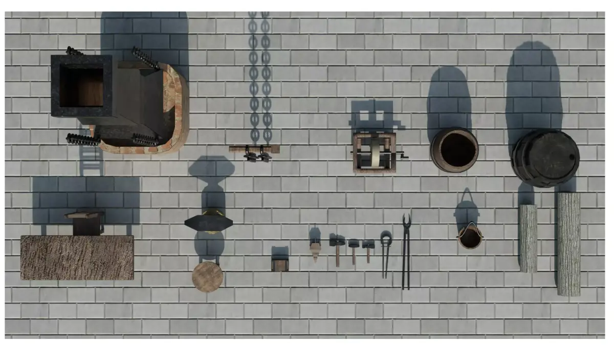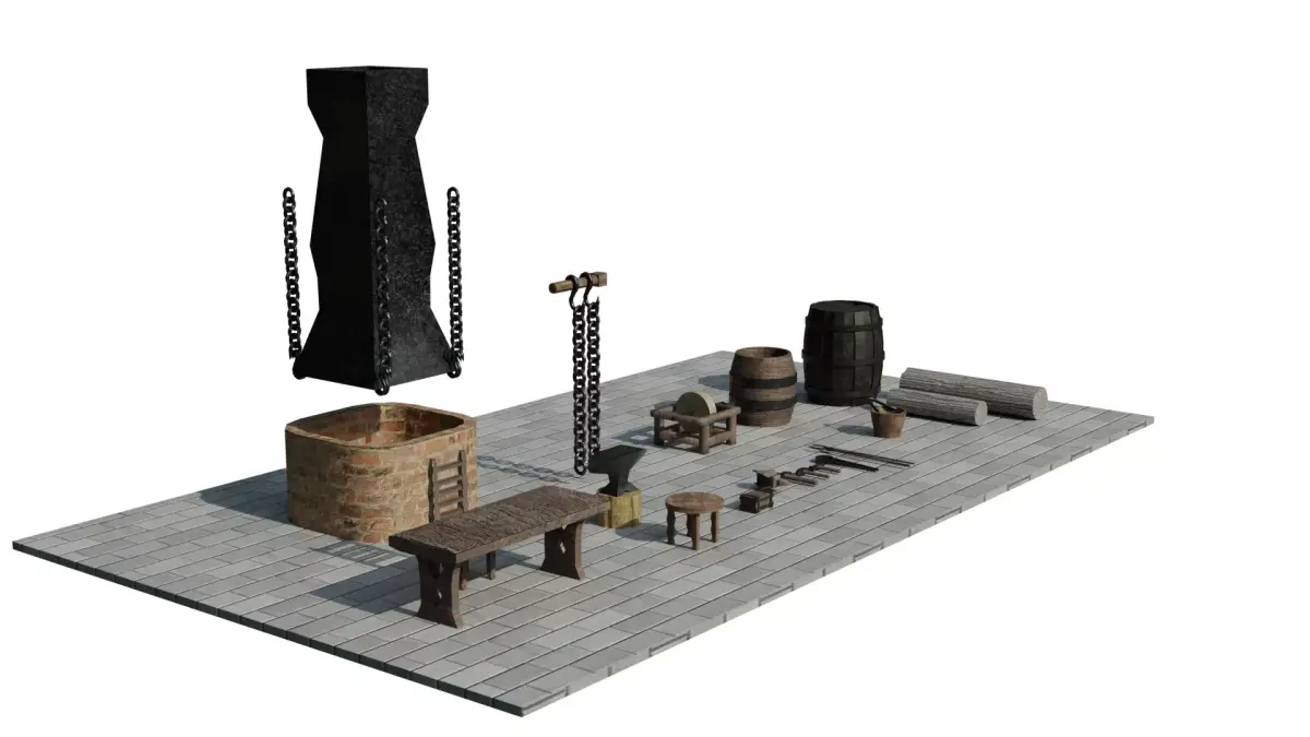 A complete medieval blacksmith props pack including over 20 unique handcrafted models optimized for games and rendering.
