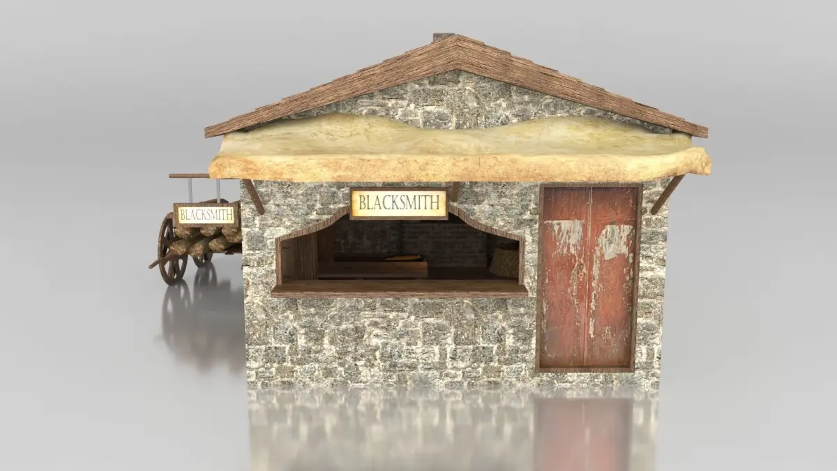 Medieval Blacksmith ShopLow Poly Game ReadySingle storey stone Blacksmith Building.You can use this model in your medieval themed villages, towns and castles.You can place your equipment such as sword and ax on the stalls in the shop and make sales.You can also make your equipment on the wood on the ceiling.There is a horse carriage right next to it.