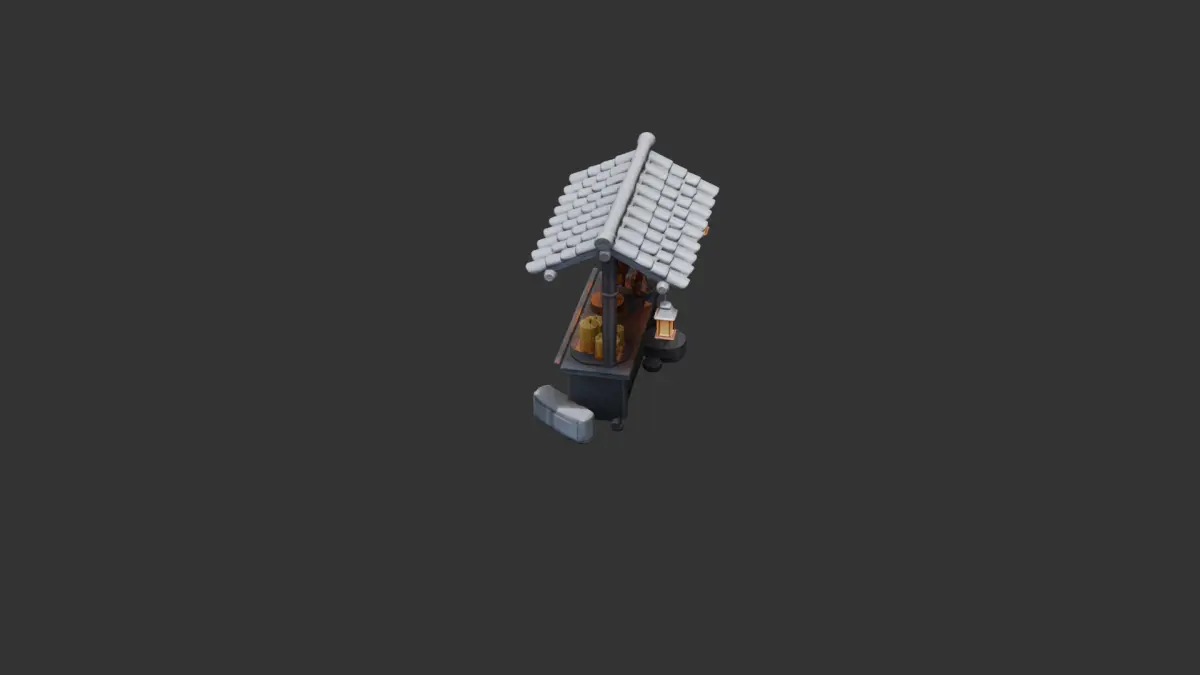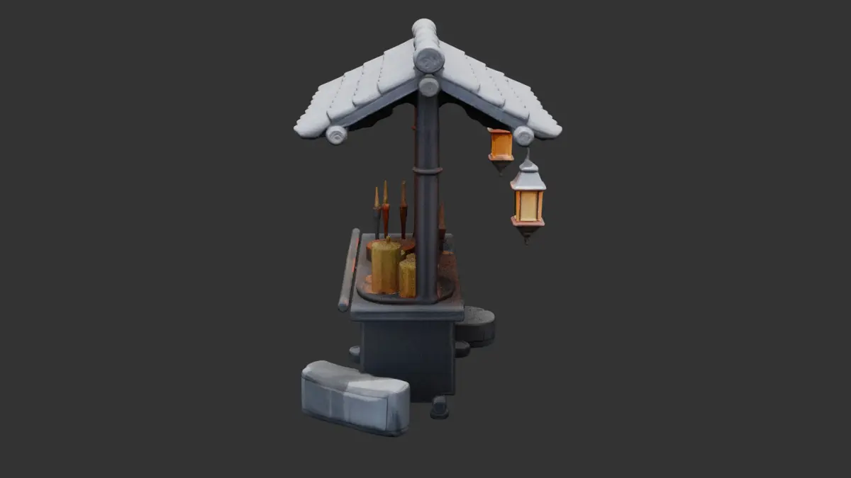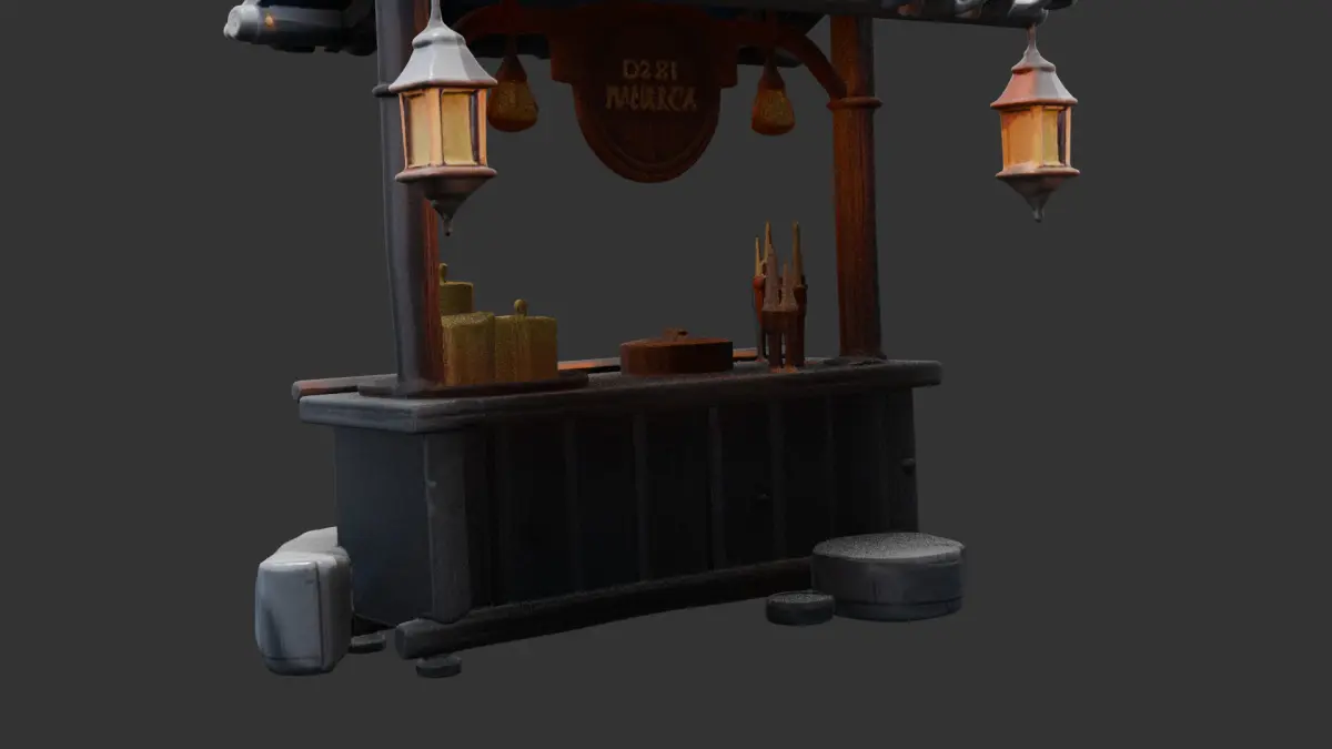 This atmospheric candle and lantern stall glows with the warm light of handcrafted illumination. The vendor table is covered in rows of candles in different sizes and holders made of tin, bronze, and clay. Hanging lanterns with iron frameworks swing from the beams, and a wax-dipping stand sits beside the table. The textures emphasize dripped wax, burn marks, and patina from frequent use. This stall is great for night markets, town festivals, or temple settings in fantasy worlds.