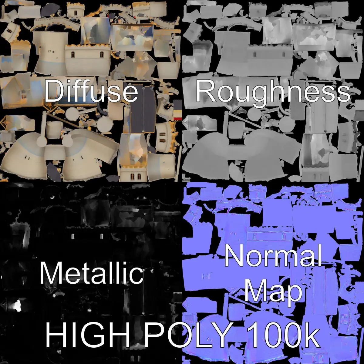 This medieval castle model pack offers three levels of detail for various applications, from mobile games to high-end production rendering. Each model is equipped with detailed textures: PBR, Diffuse, NormalMap, and reflection/roughness/metallic, perfect for modern engines. Ideal for films, video games, or VR experiences, it provides accurate UV mapping with no overlaps. Experience the art of medieval architecture through perfectly rendered towers, battlements, and flags. Textures are 4096x4096, ensuring high quality and realism. The first image is the reference used for creating the 3D model. It is important to carefully evaluate the quality of the model by examining the preview images that display the topology and polygonal mesh. These previews (WIRE and WEB 3D Preview) clearly demonstrate how accurately the model matches the original reference and how well the geometry has been executed. Like and leave a comment if you appreciated the model!