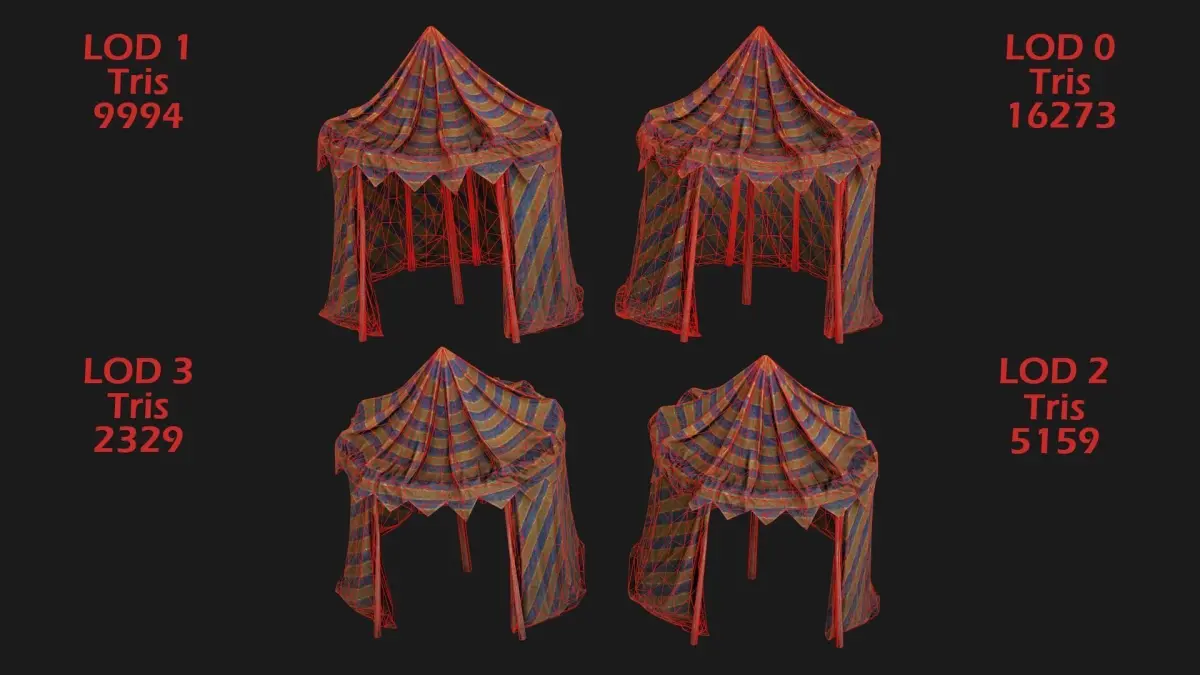Game ready model. Market Stalls Tent fully textured, sculpted and rendered with Physical based rendering (PBR) - Shown images have been rendered in Marmoset Toolbag .The models contains lods, detailed information on the images.The model consists of two UV Maps :Tent(4096x4096).