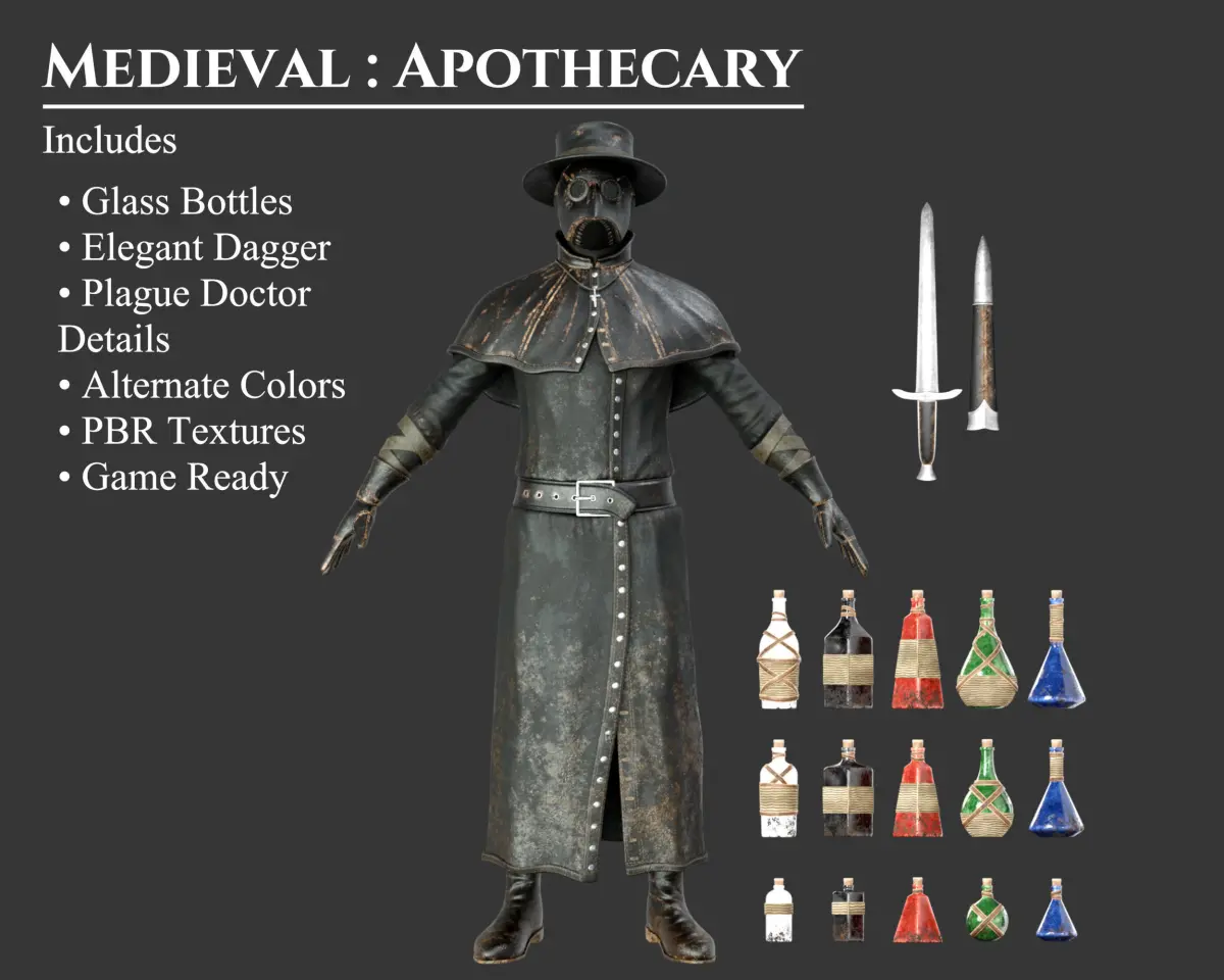 - This Collection Set offers a Plague Doctor character, Elegant Dagger & Sheath, and Glass Bottles & Potions. These models can be purchased separately. These models may be included in other collections for a different price.