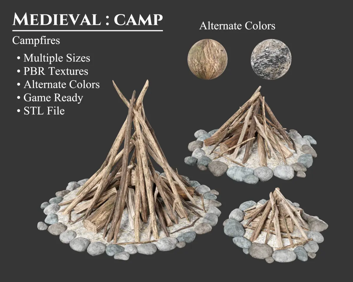 - This collection set offers models including multiple Campfires, Firewood, Logs, and Sticks, perfect for building the ideal campfire. Each model is optimized for games and real time with Low-Poly meshes and PBR materials. STL files are also provided for 3D printing. These models can be purchased separately and may be included in other collections for a different price.