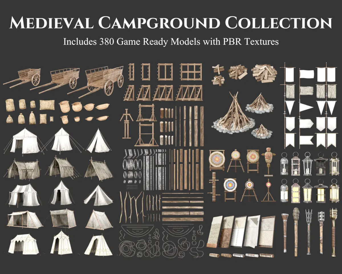 - This Collection Set offers 53 separate products, with a total of 381 individual models perfect for building a medieval campground or military barrack. This collection offers tents, flags, banners, torches, lanterns, training targets and dummies, carts, campfires, and general building elements.